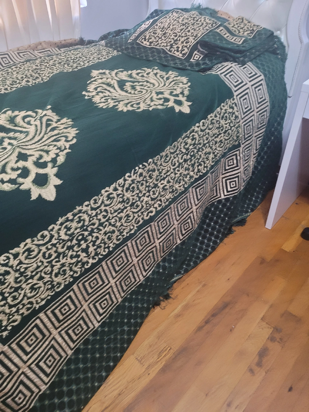 34Selling a green bedspread with a matching pillow cover! It has a beautiful, detailed pattern. The material feels soft and cozy, perfect for adding a touch of elegance to your bedroom. It's in great condition and ready for a new home