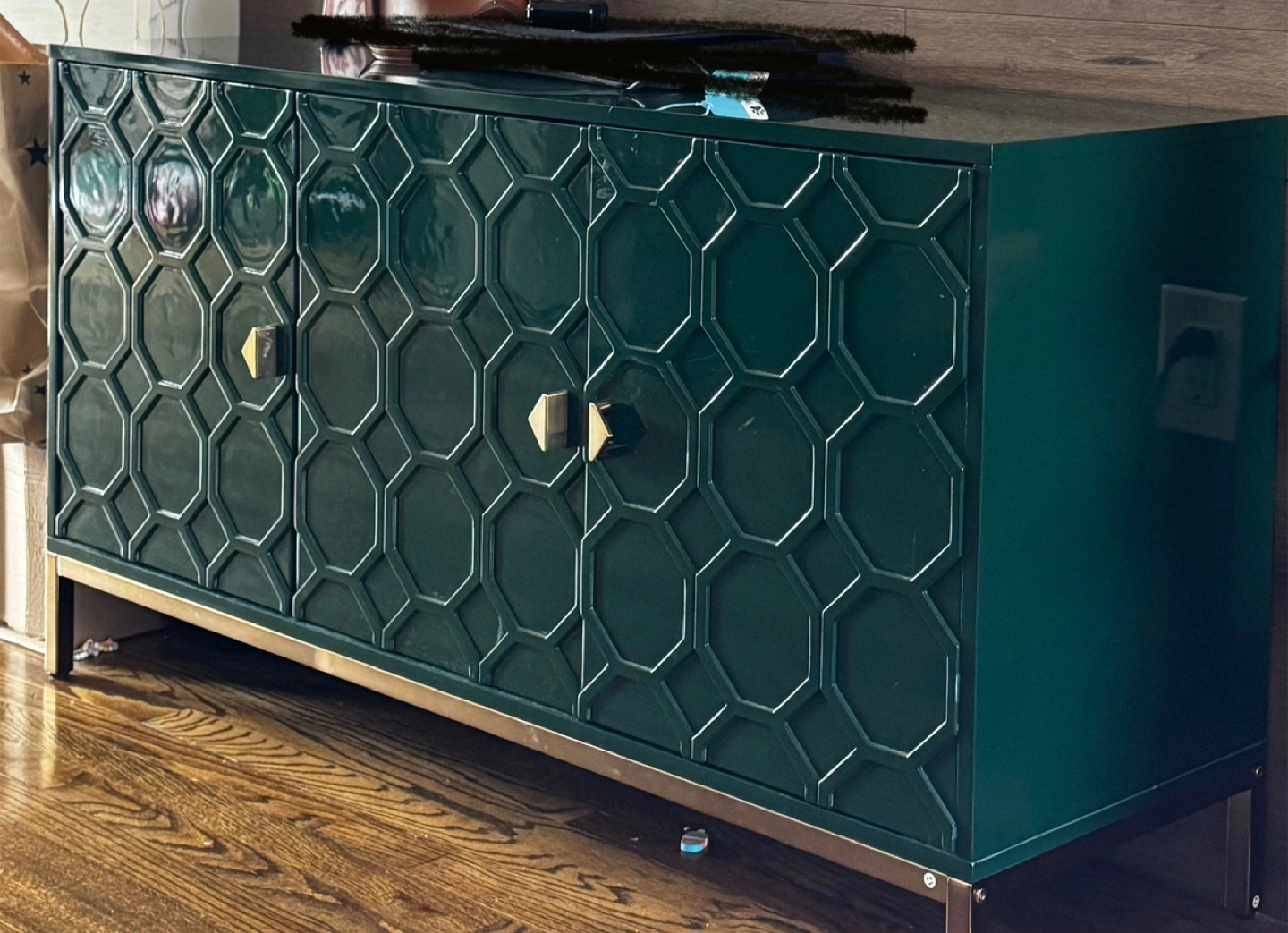 Selling a stylish green cabinet with a unique geometric pattern on the doors. It features gold-colored handles and a matching base. Perfect for adding a touch of modern elegance to any room! Description: in pictures.