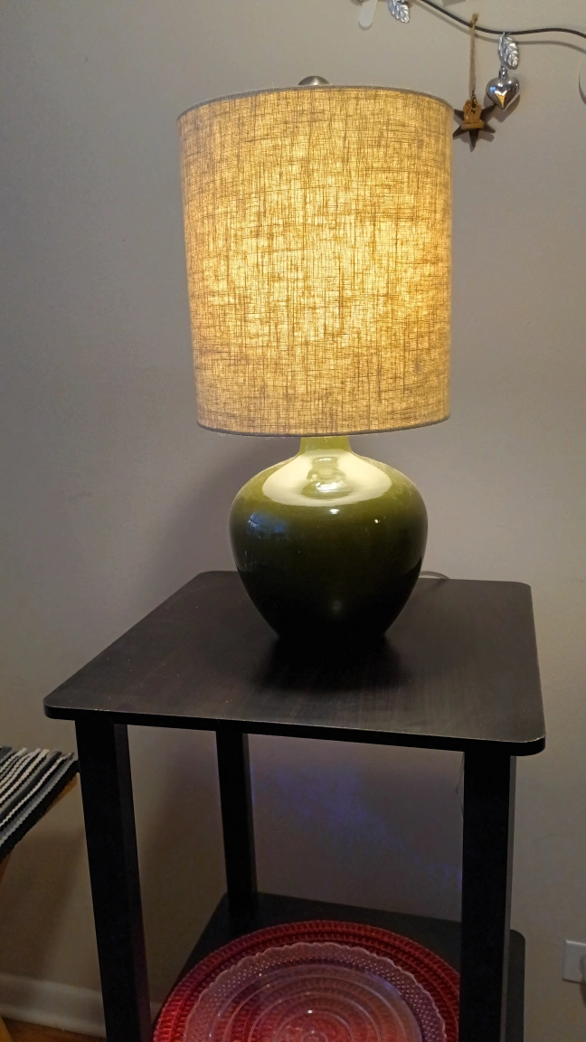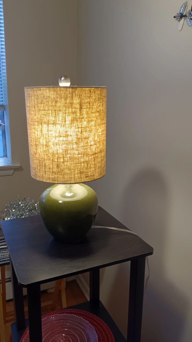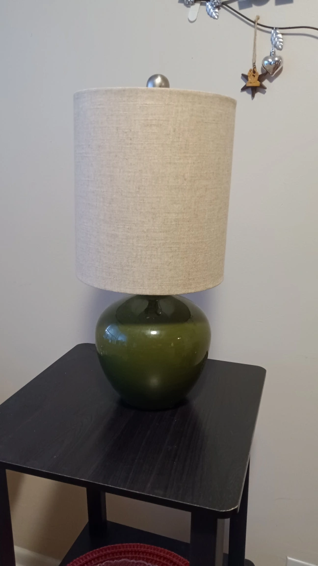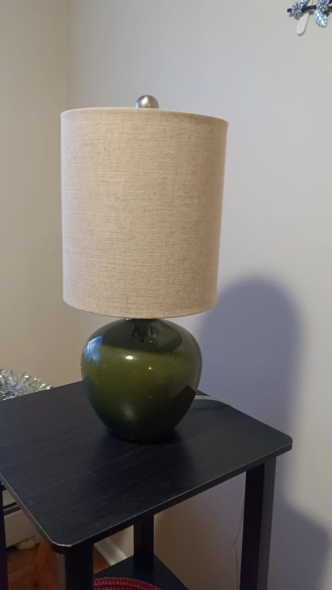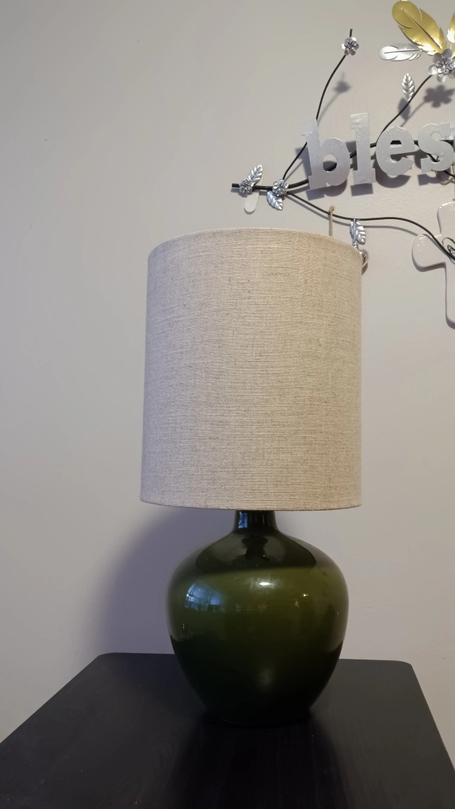 80A lovely green ceramic lamp. The lampshade is neutral. Could be used for a soft light at night. 18 in tall