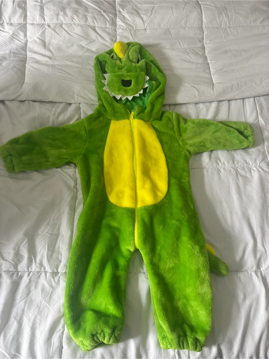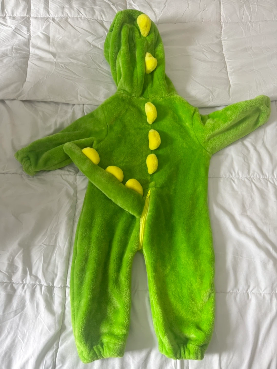 65Here's an adorable green dinosaur costume onesie! It's perfect for dress-up or Halloween. It features a hood with a cute dinosaur face and a tail. Your little one will look so cute in this!. Just used the last Halloween a few hours.