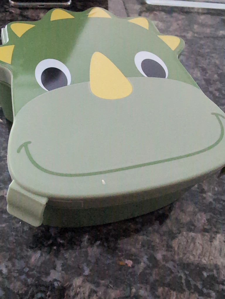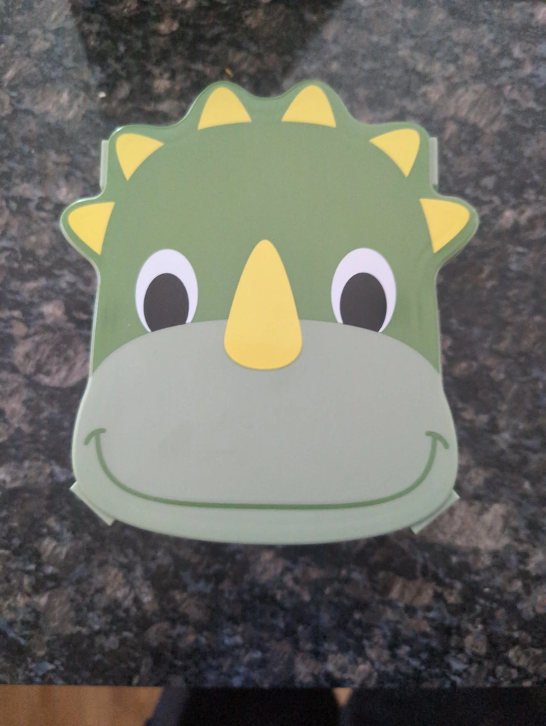 52Selling a cute dinosaur-shaped lunch box for kids! It's green with yellow accents and has a friendly dinosaur face. Perfect for packing school lunches or snacks on the go