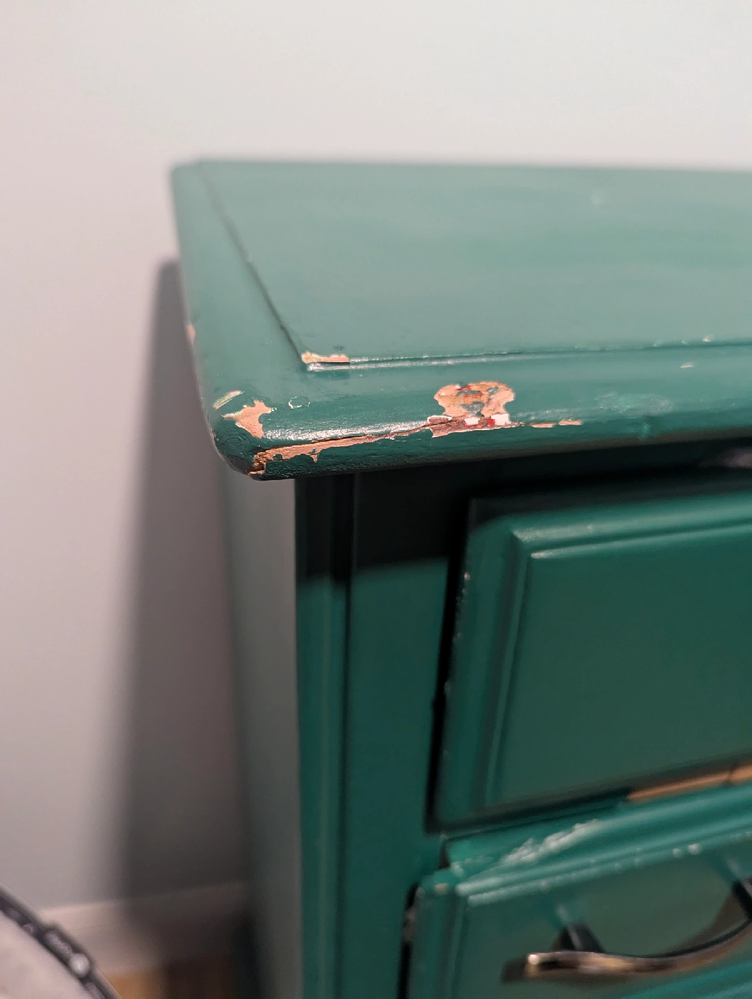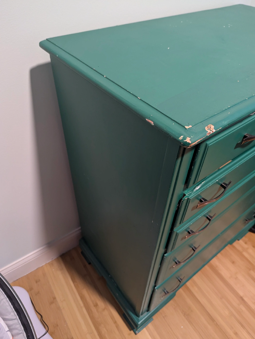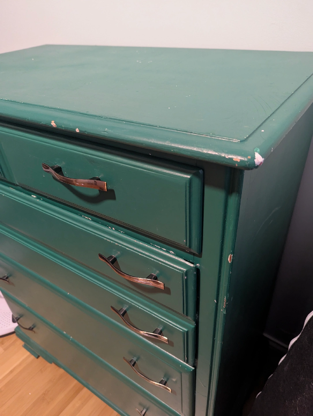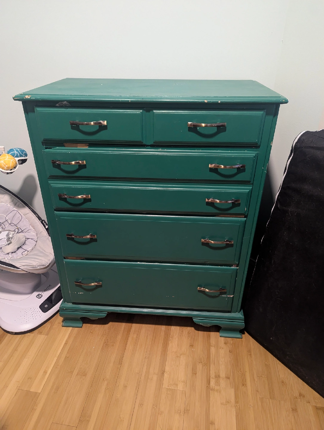 green, 3.5 drawer (top drawer isn't as deep) dresser. It's a great, solid wood dresser with a few dings from our last move. We need to make room for a nursery so it's gotta go.