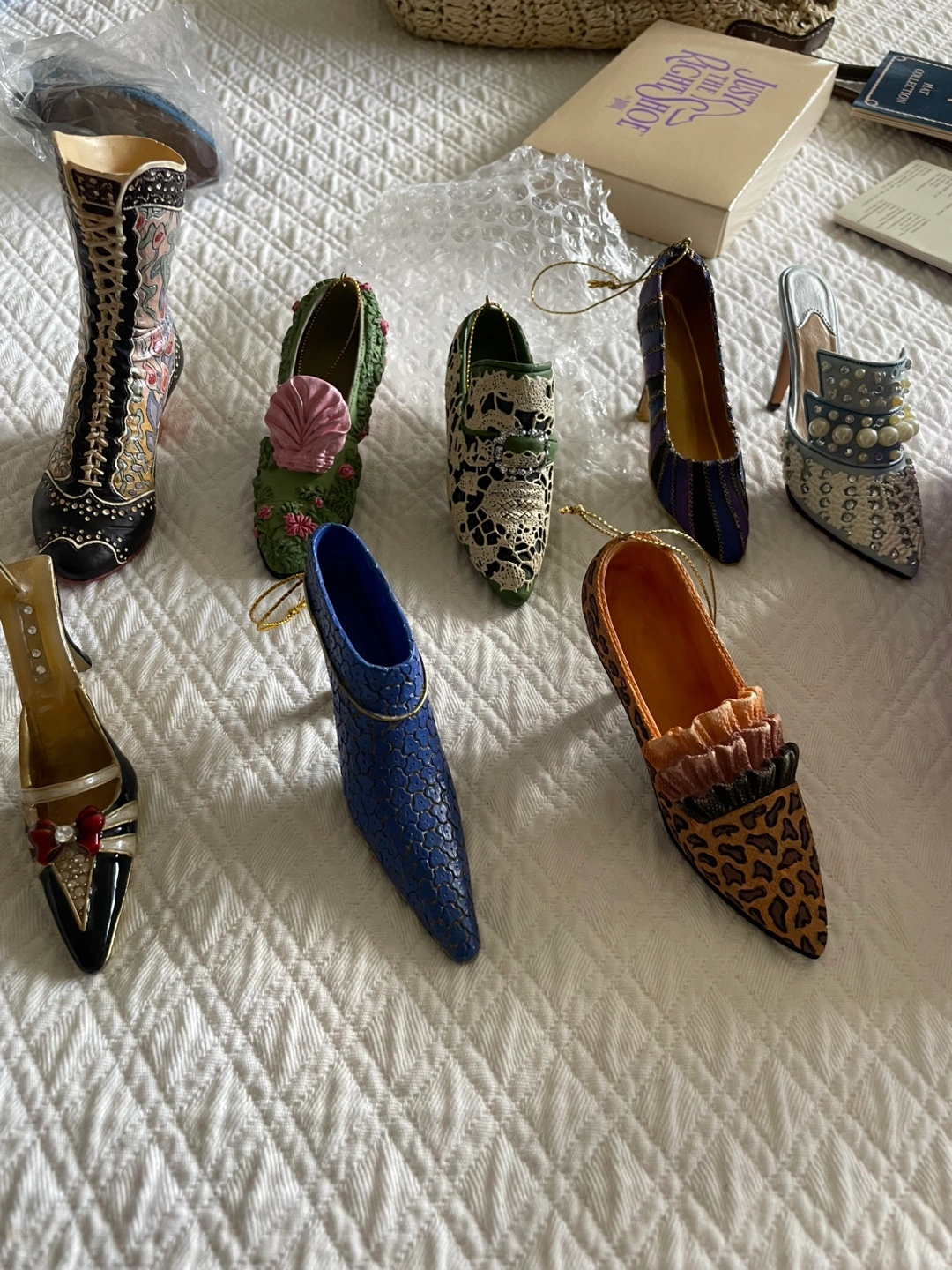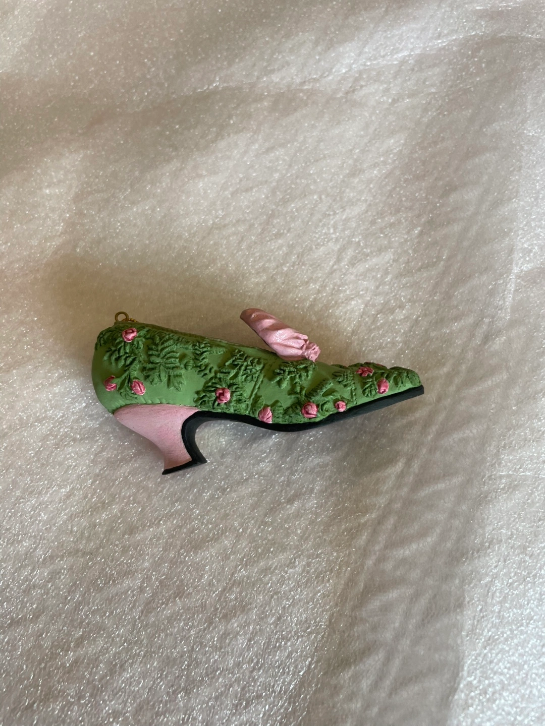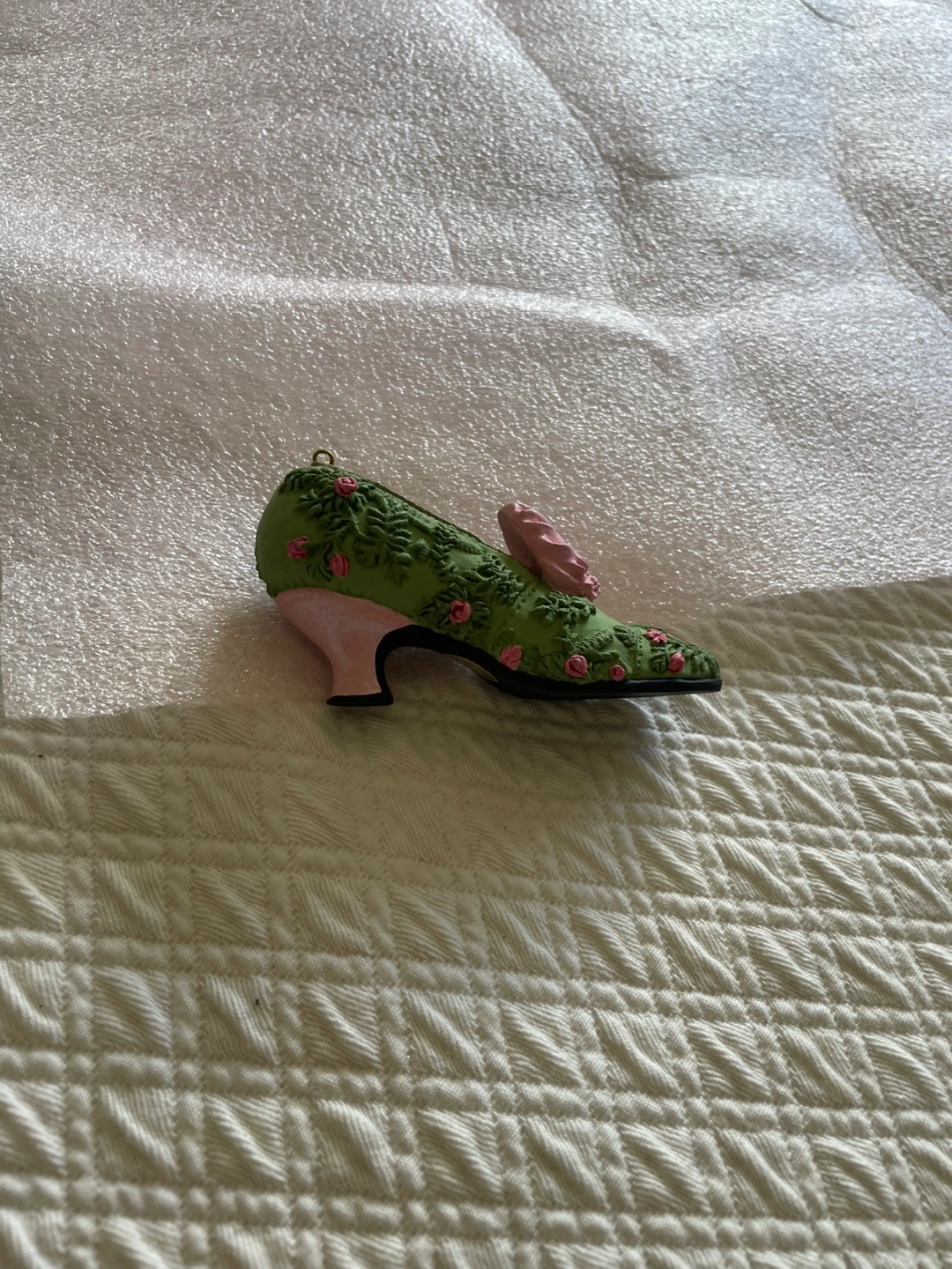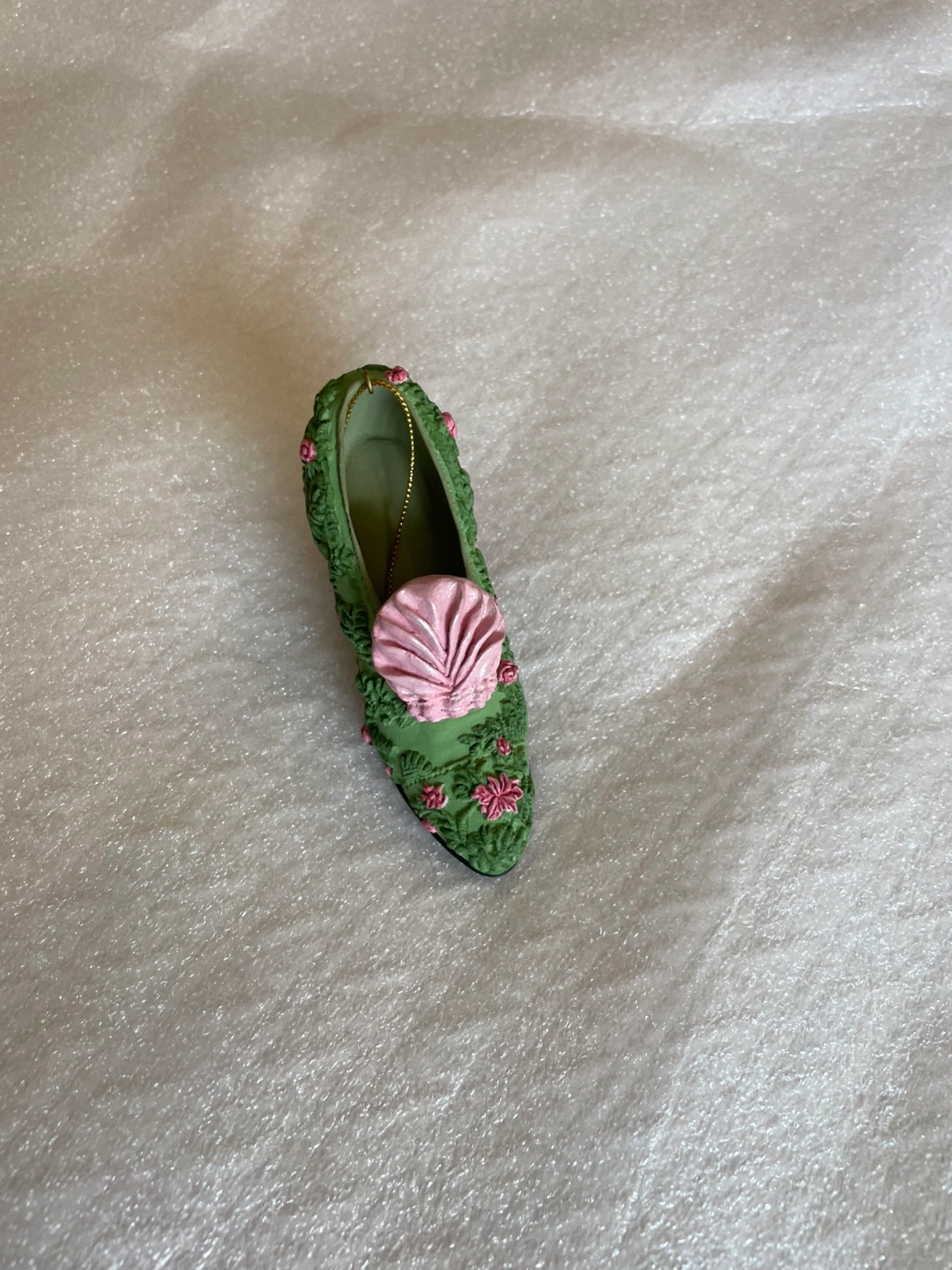 Here's a charming green shoe ornament with a floral design! It's perfect for adding a touch of whimsy to your decor or as a unique gift for a shoe lover Each Shoe sold separately $8-$15