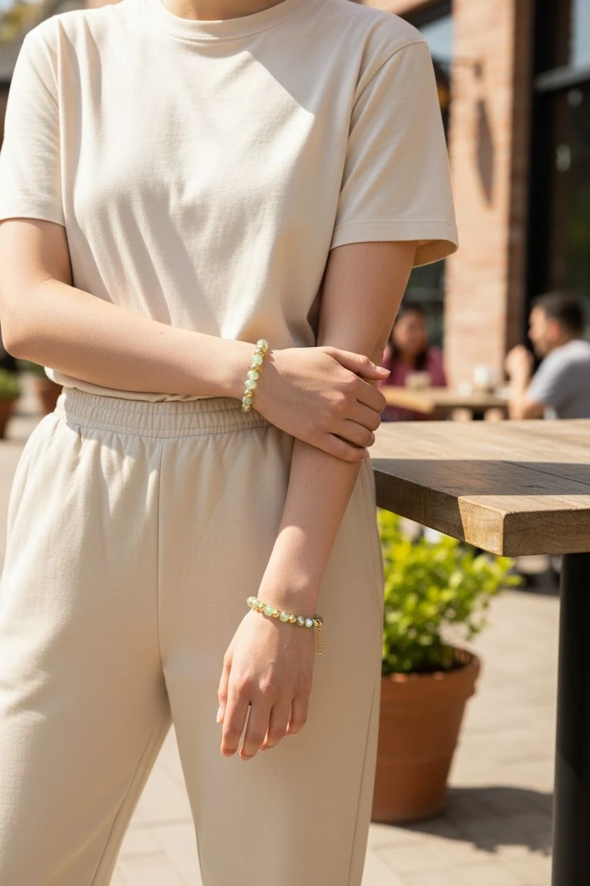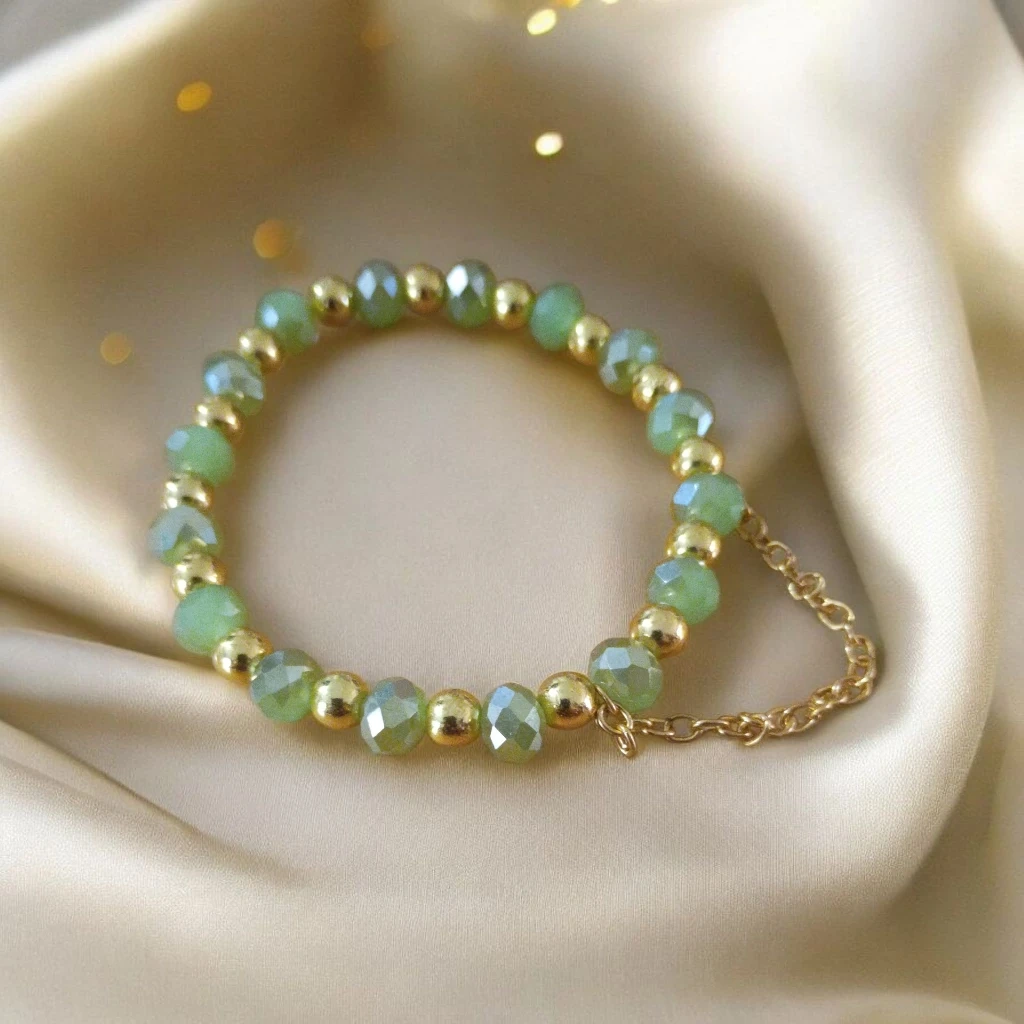 60This is a beautiful beaded bracelet featuring green and gold beads. It's in great condition and would make a lovely addition to any outfit