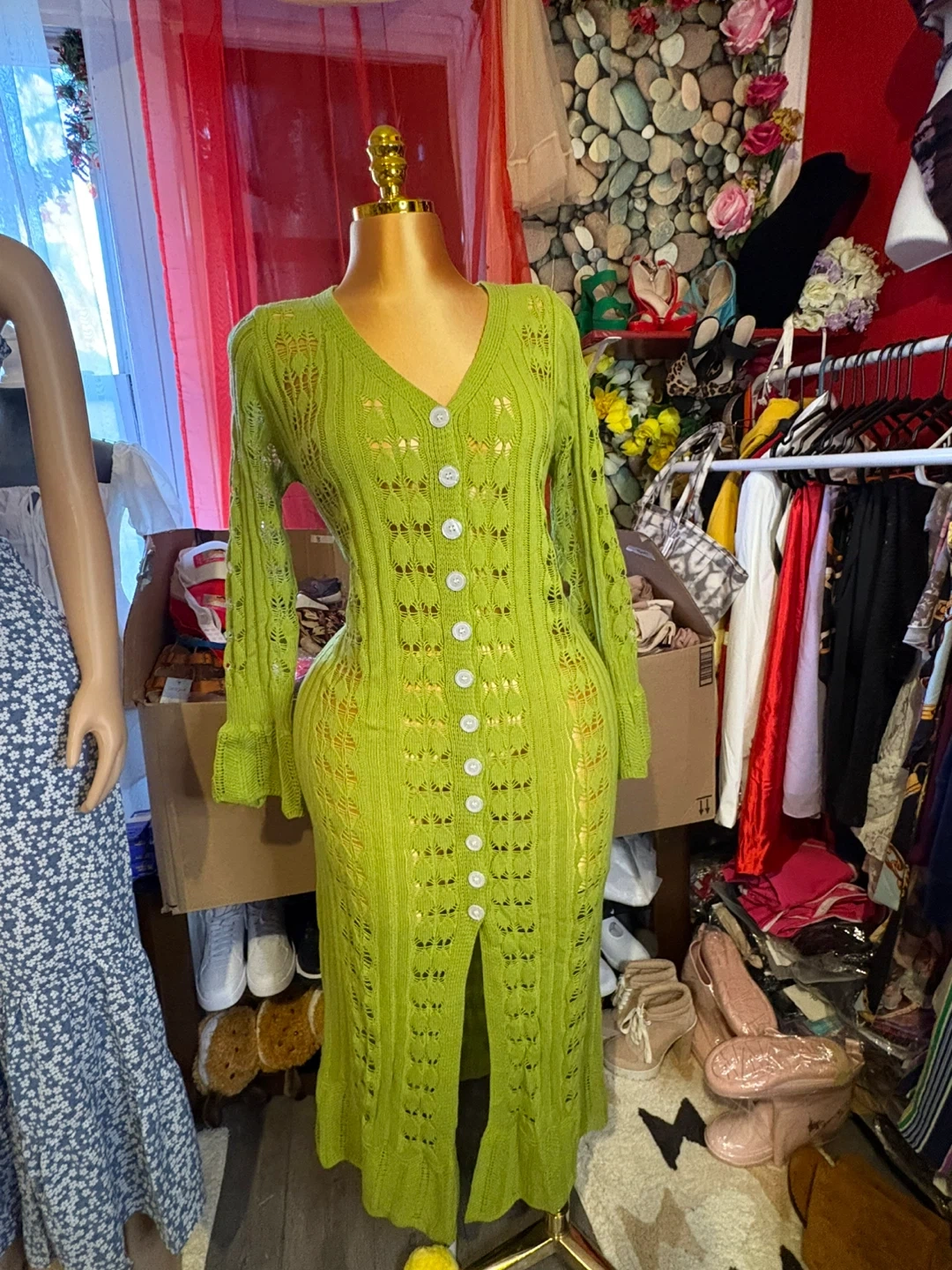 153This is a lovely green knit dress with button-down detailing. It's perfect for layering or wearing on its own! The knit material is soft and comfortable. It's in great condition and ready for a new home