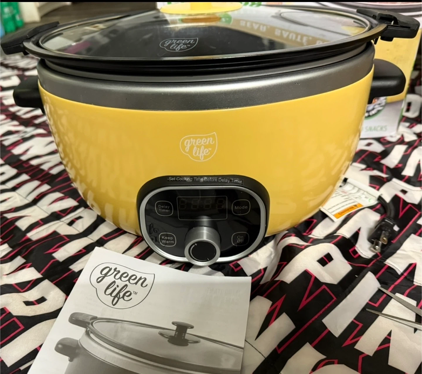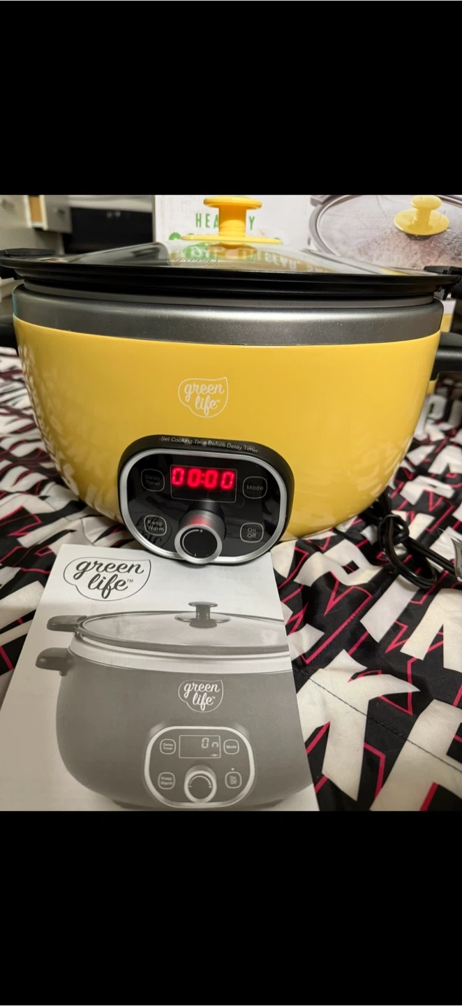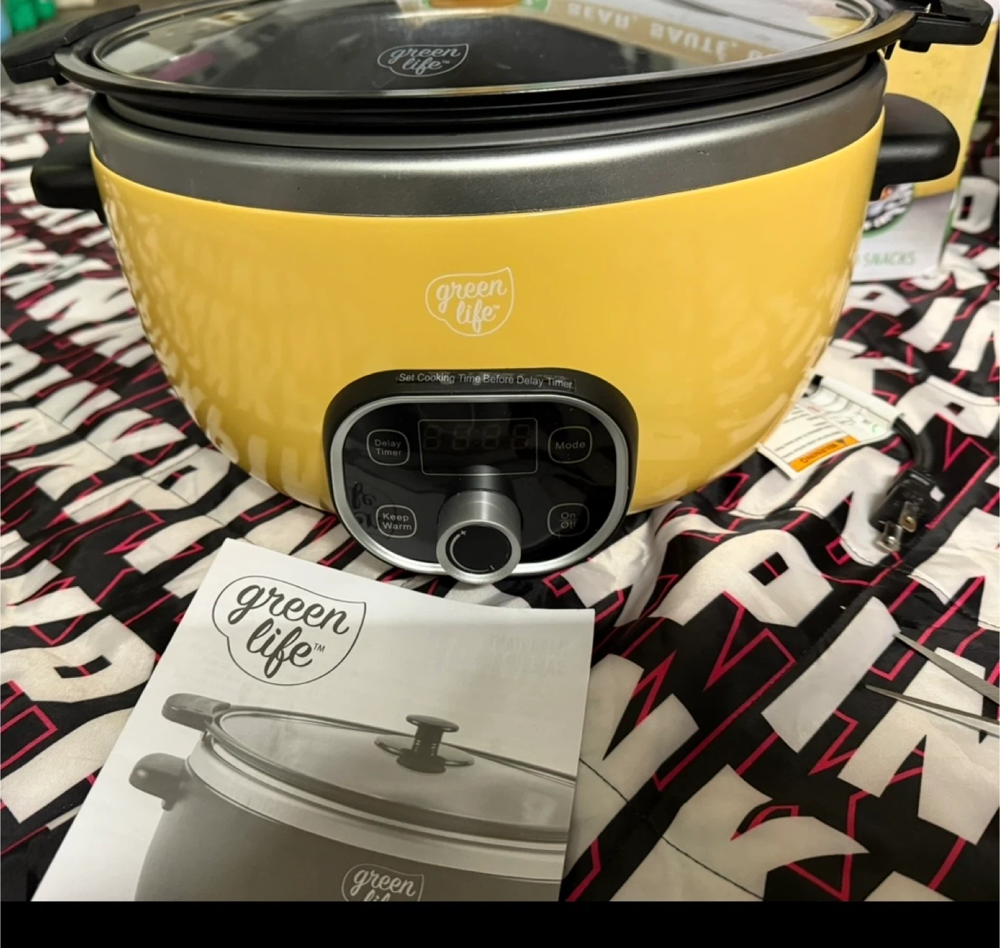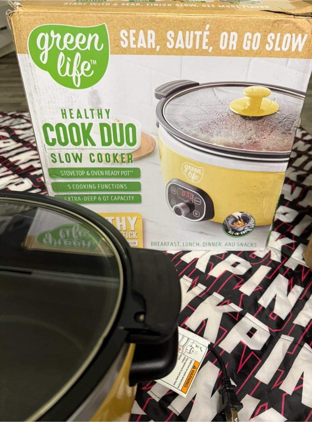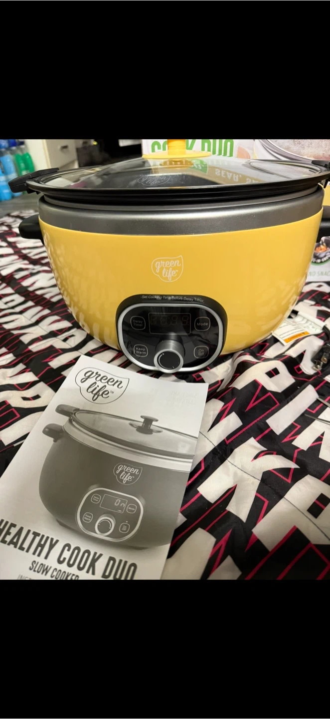 I'm selling a Green Life Healthy Cook Duo Slow Cooker! It has 5 cooking functions and an extra-deep 6-quart capacity. This is perfect for breakfast, lunch, dinner, and snacks. It comes with the box and instructions