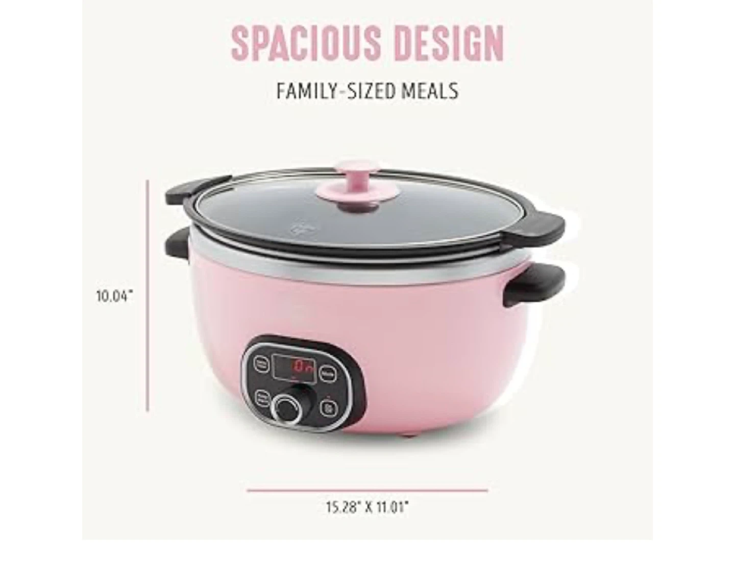 This Green Life slow cooker is perfect for family-sized meals! It features 3 easy modes and a delay start timer. The pot and lid are dishwasher safe, and it has a removable nonstick pot. You can sear, saute, bake, slow cook, or even steam with it! It measures 10.04" x 15.28" x 11.01".
