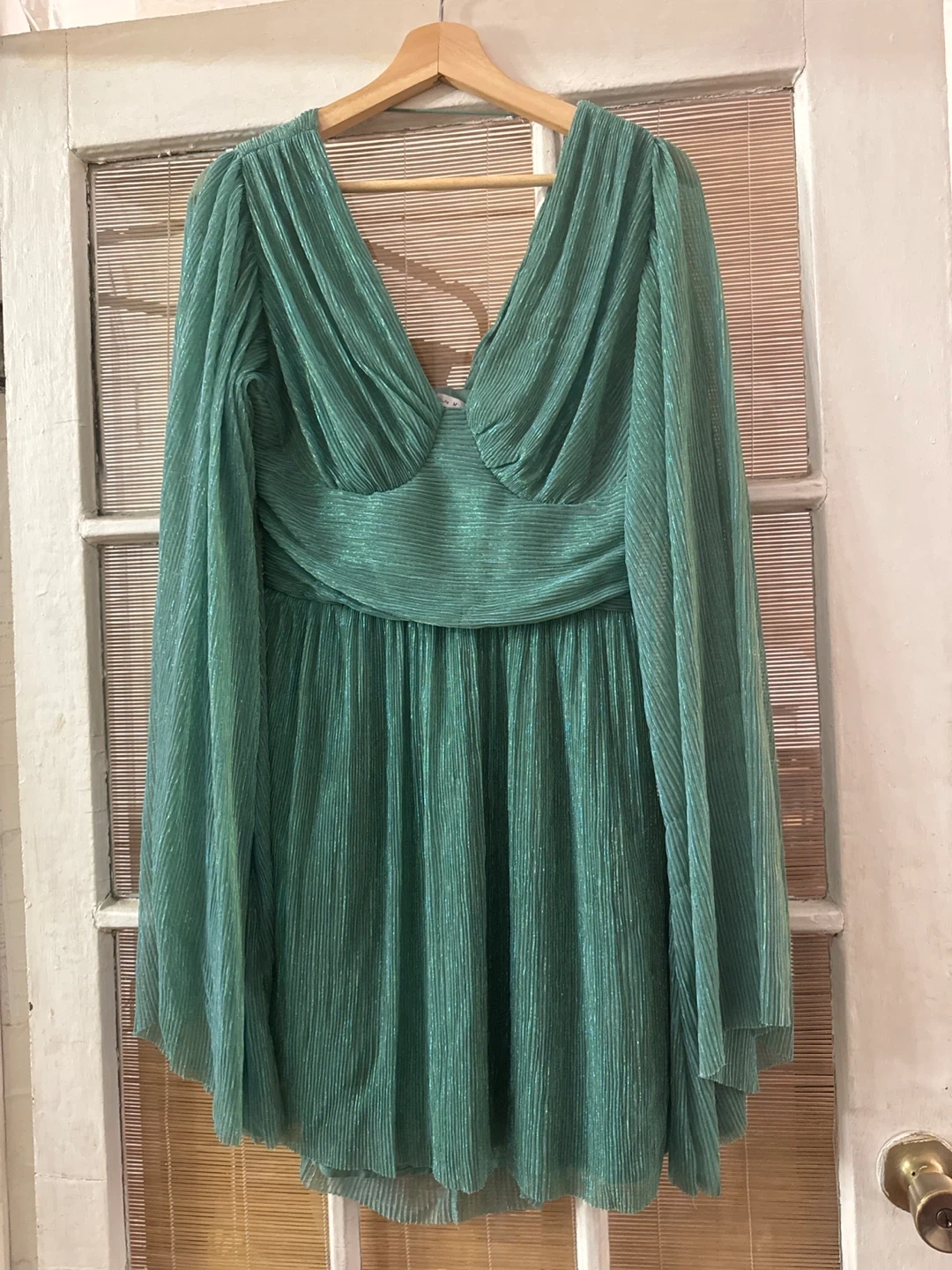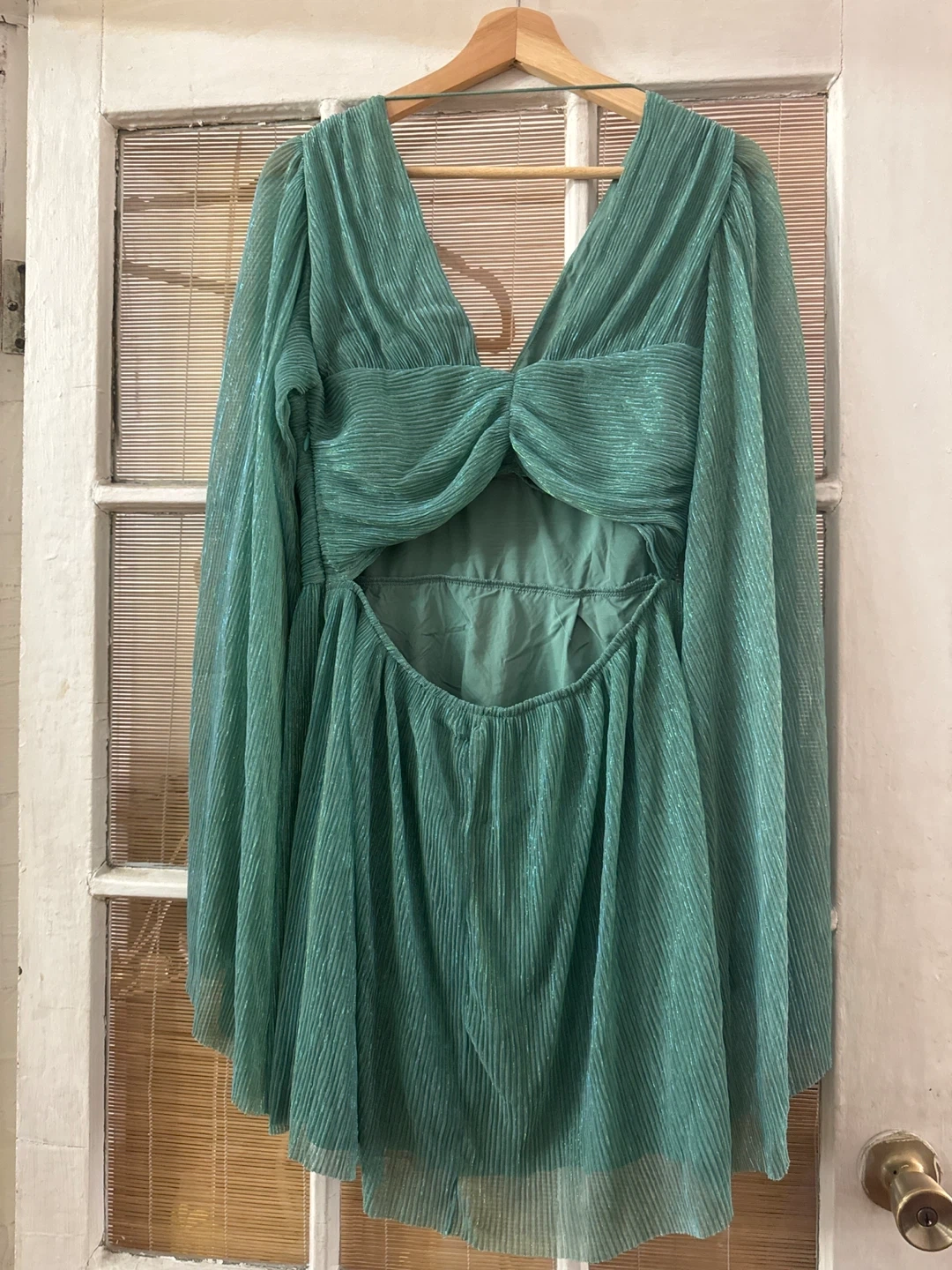 This is a cute green mini dress with long sleeves. It has a unique design with a cutout in the back. The material has a subtle shimmer that catches the light nicely. It's in great condition and ready for a new home