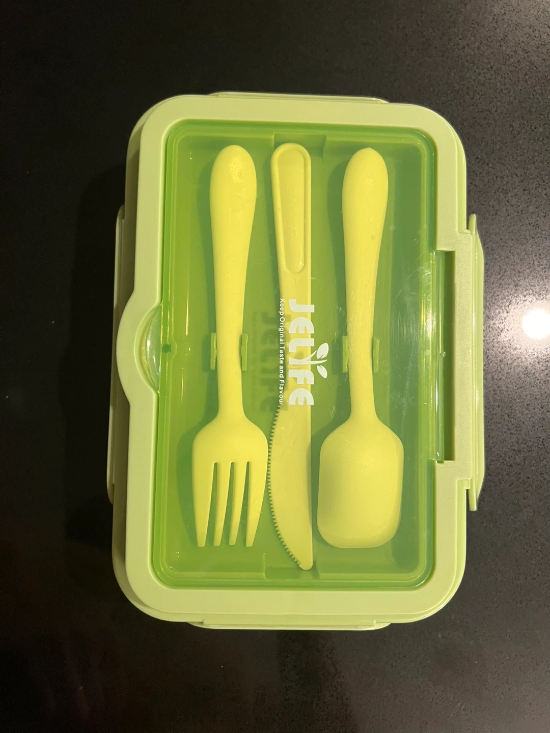 60This is a lunch box in a vibrant green color! It comes with a matching set of utensils (fork, knife, and spoon) that fit neatly inside the lid. Perfect for packing lunches for school or work