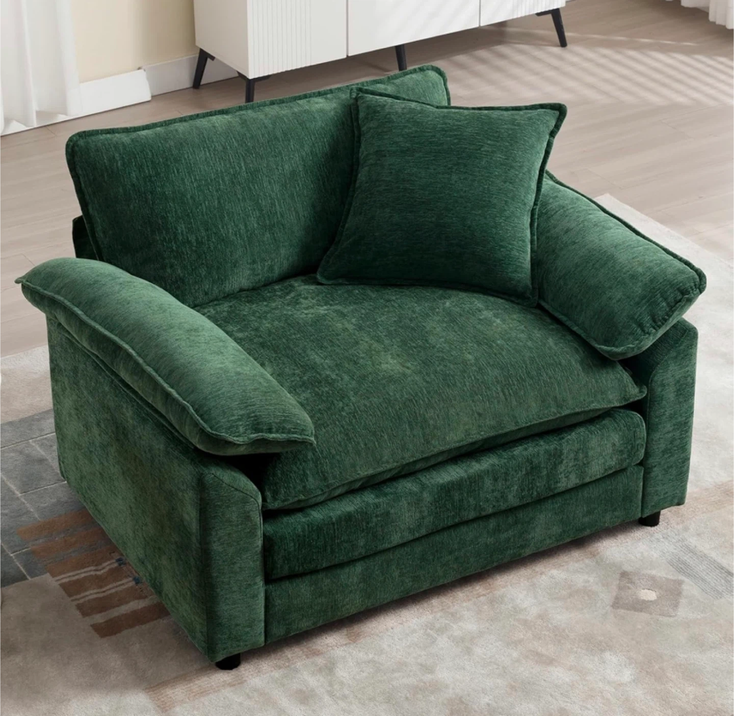 73Selling a comfy, oversized club chair in green! It's perfect for relaxing and adds a cozy touch to any room. The chair is in great condition and ready for a new home. It's a great spot to curl up with a book or watch a movie