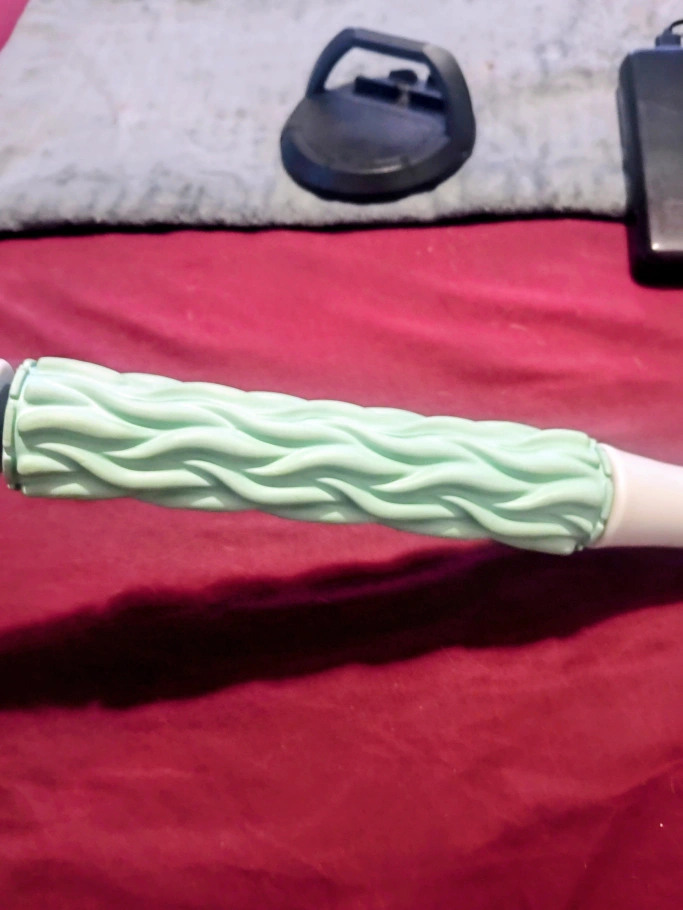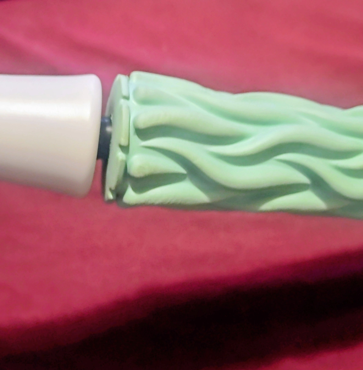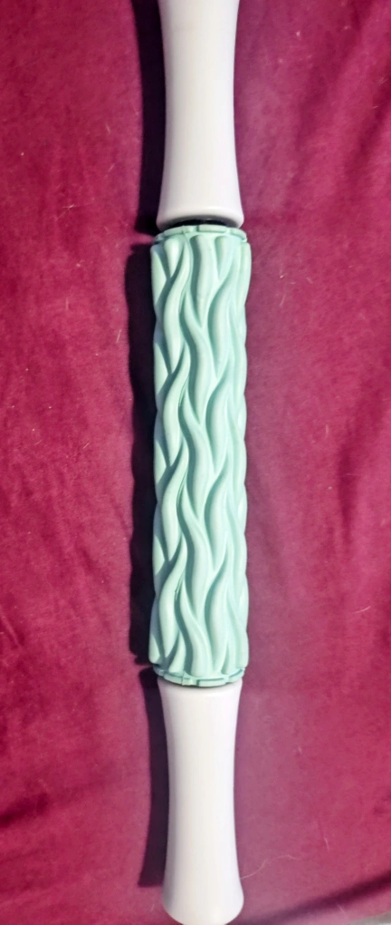This is a green rolling massager with a unique wave pattern on the roller. It's in good condition and ready for your next relaxing session.