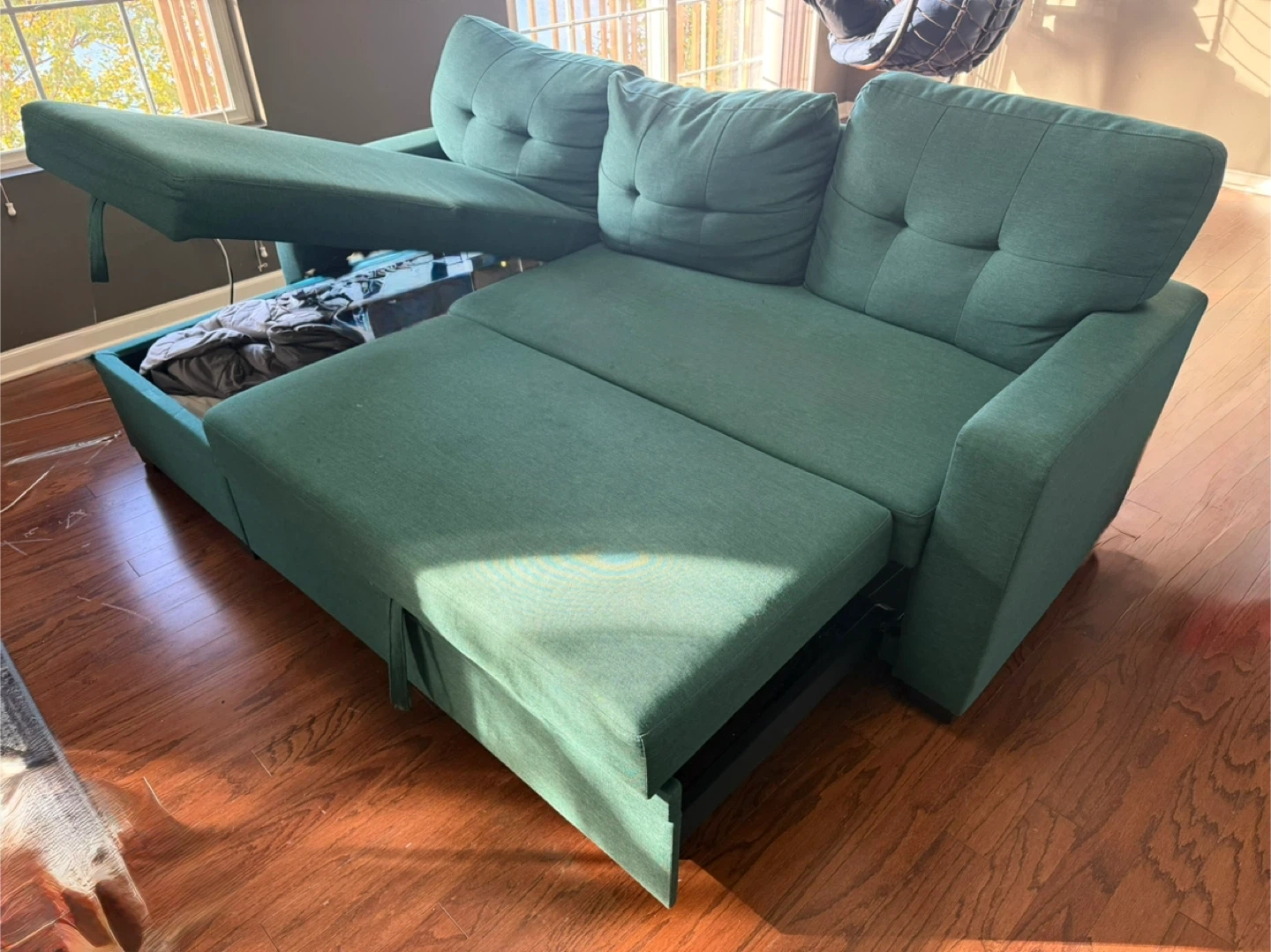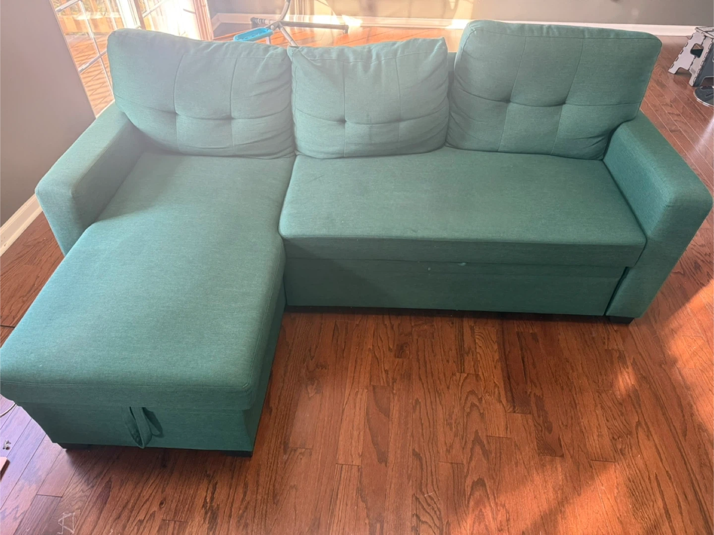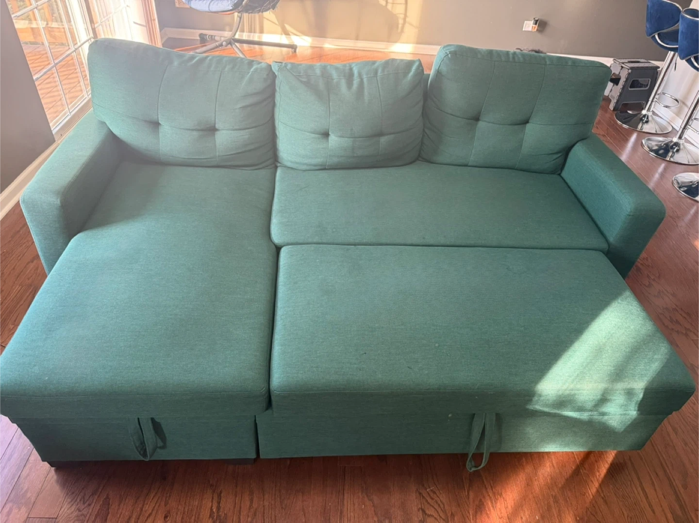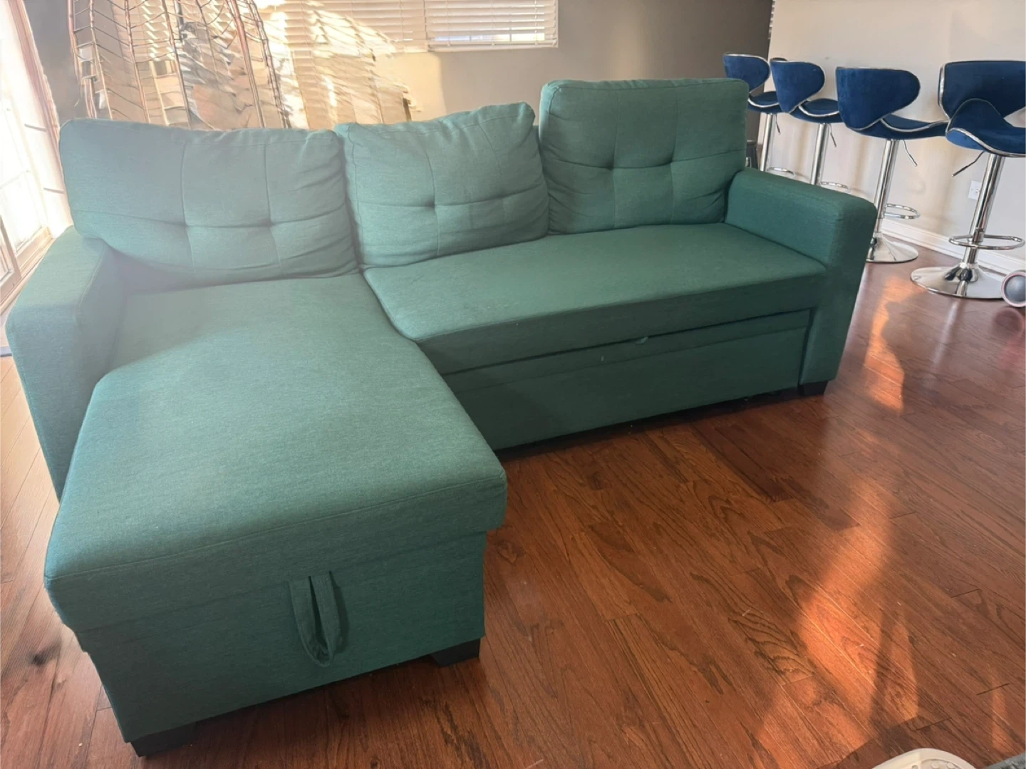 60Selling a stylish and comfortable green sectional sofa that’s perfect for relaxing or hosting guests! This sofa features a spacious hidden storage compartments under the chaise — great for storing blankets, pillows, or other essentials. The sofa also pulls out easily to create a flat lounging or sleeping surface, making it ideal for movie nights or overnight guests. Perfect for apartments, condos, or anyone looking to maximize both comfort and functionality in their living space.