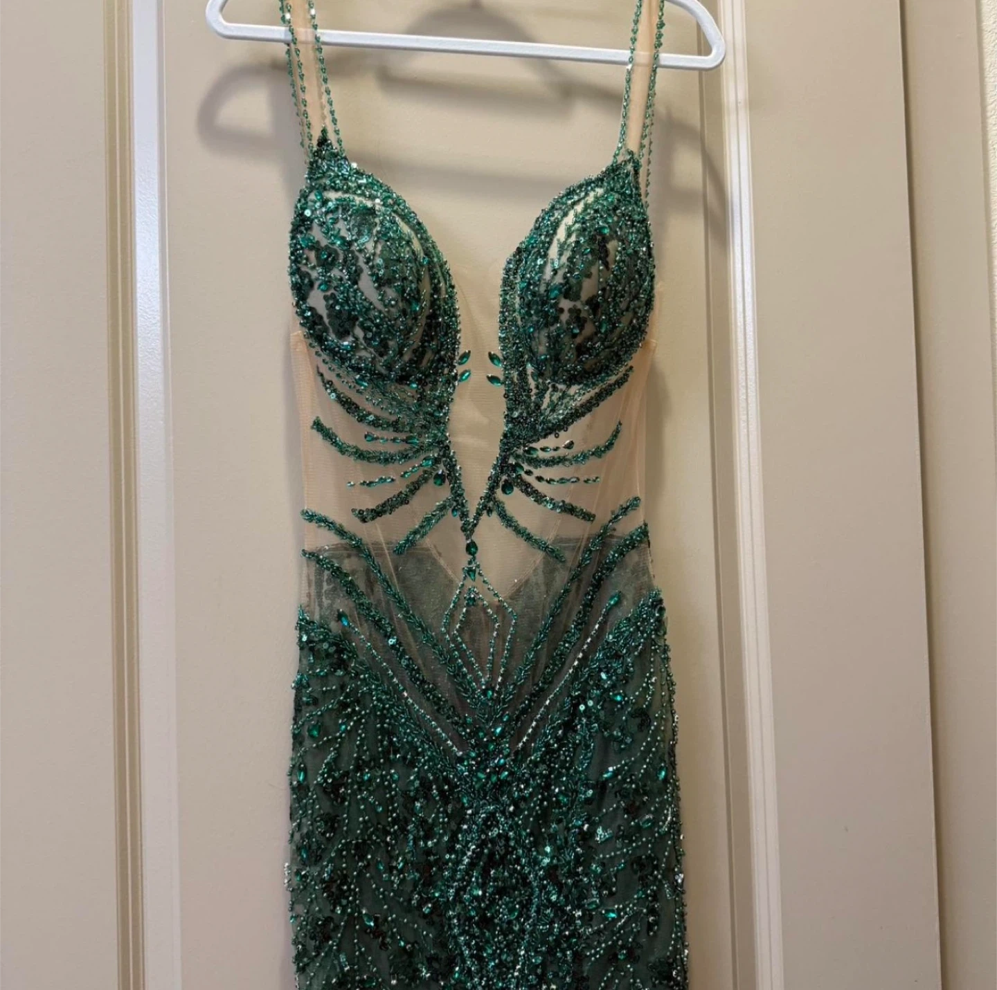 65Selling a stunning green formal dress, beautifully embellished with sequins. It's perfect for a special occasion and sure to turn heads. The dress features intricate detailing and a flattering silhouette. It's in great condition and ready for a new home!