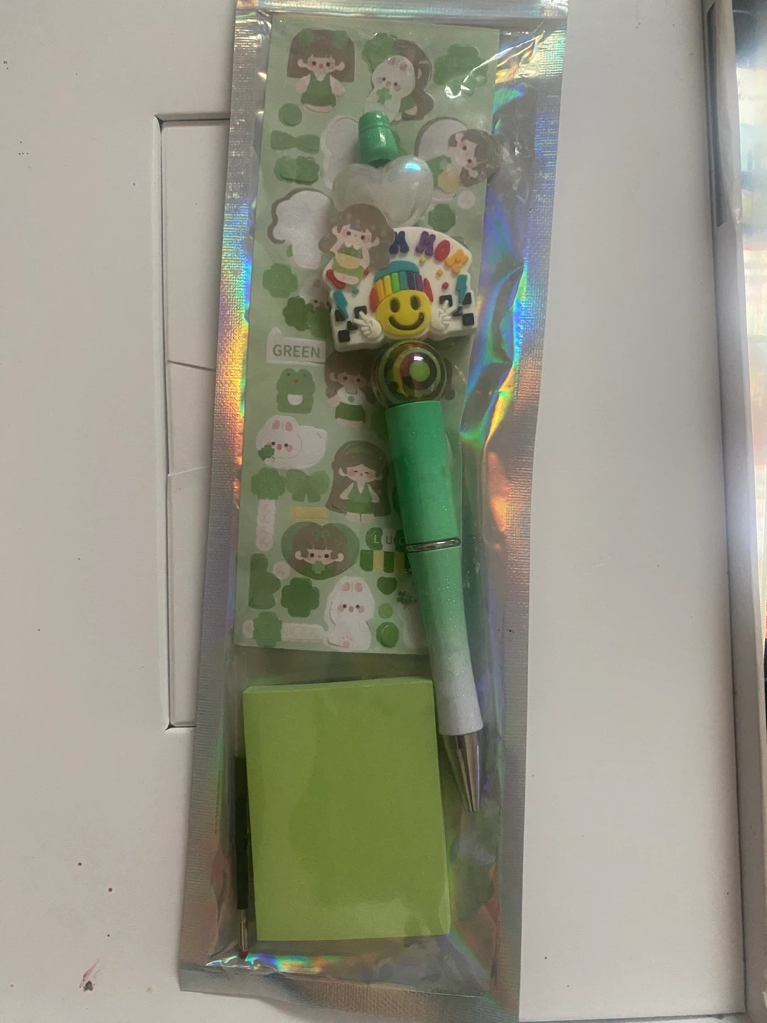 75I'm selling a cute green stationery set! It includes stickers, a pen, and a sticky note pad. It's all brand new and ready for a new home