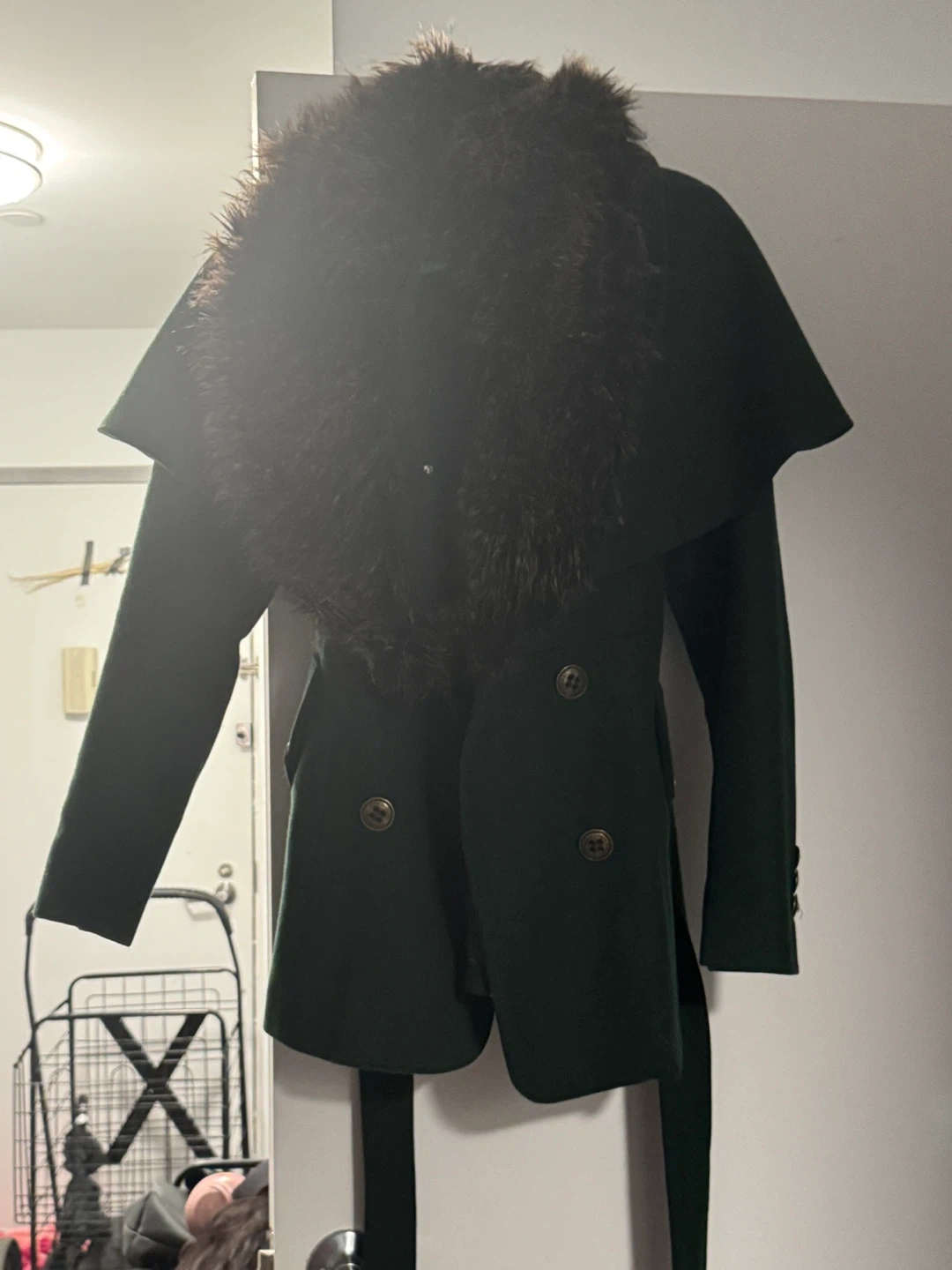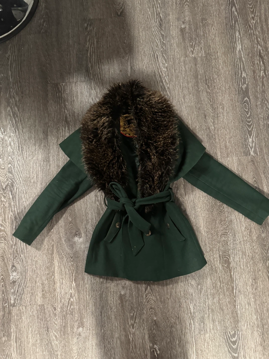 Selling a stylish green coat featuring a unique fur collar! This coat is perfect for adding a touch of elegance to your wardrobe. It has a tie around the waist. It goes great with jockey boots. Has a small stain on right backside; a cleaners can’t take out.