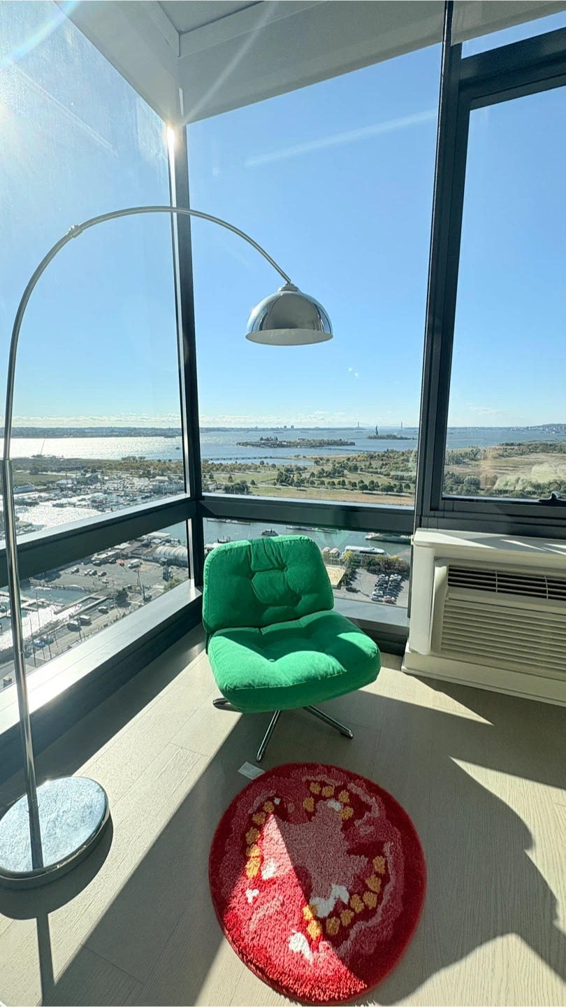Show allGreen Swivel Accent Chair and floor lamp and tomato rug