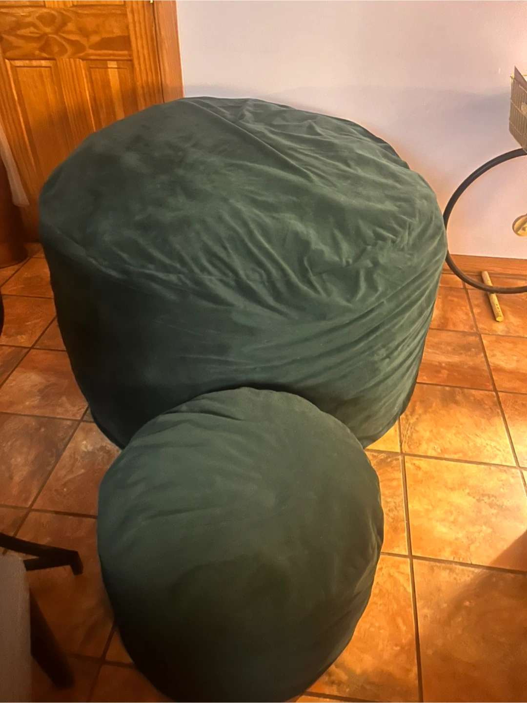 60Selling a comfy green bean bag chair with a matching ottoman. It's in great condition and perfect for lounging around! The cover comes off for easy washing! This thing is so great for naps!