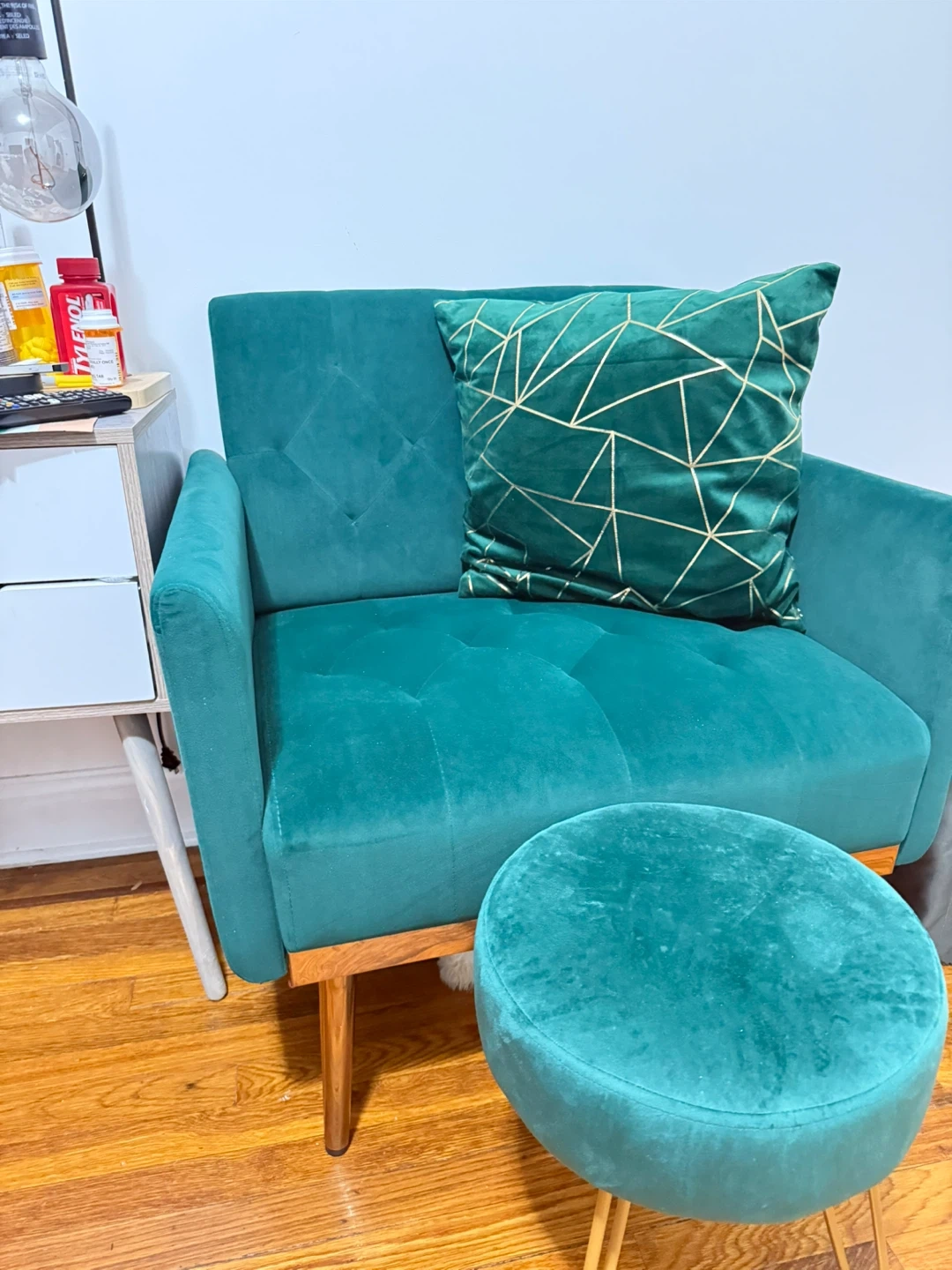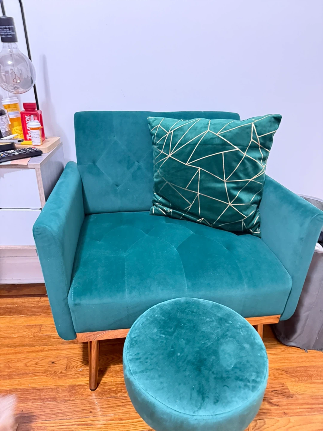 10Selling a lovely green velvet armchair with a matching ottoman! It's in great condition and would be a stylish addition to any living room or bedroom. The velvet material is soft and comfortable, perfect for relaxing after a long day. The ottoman can be used as a footrest or extra seating