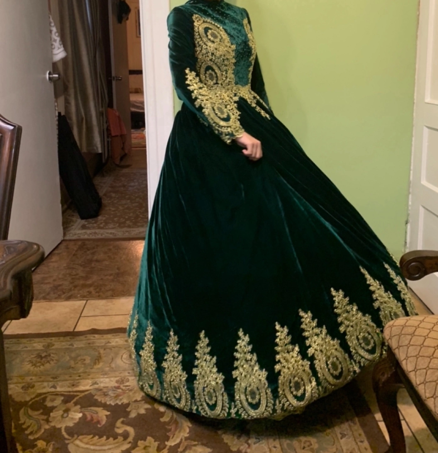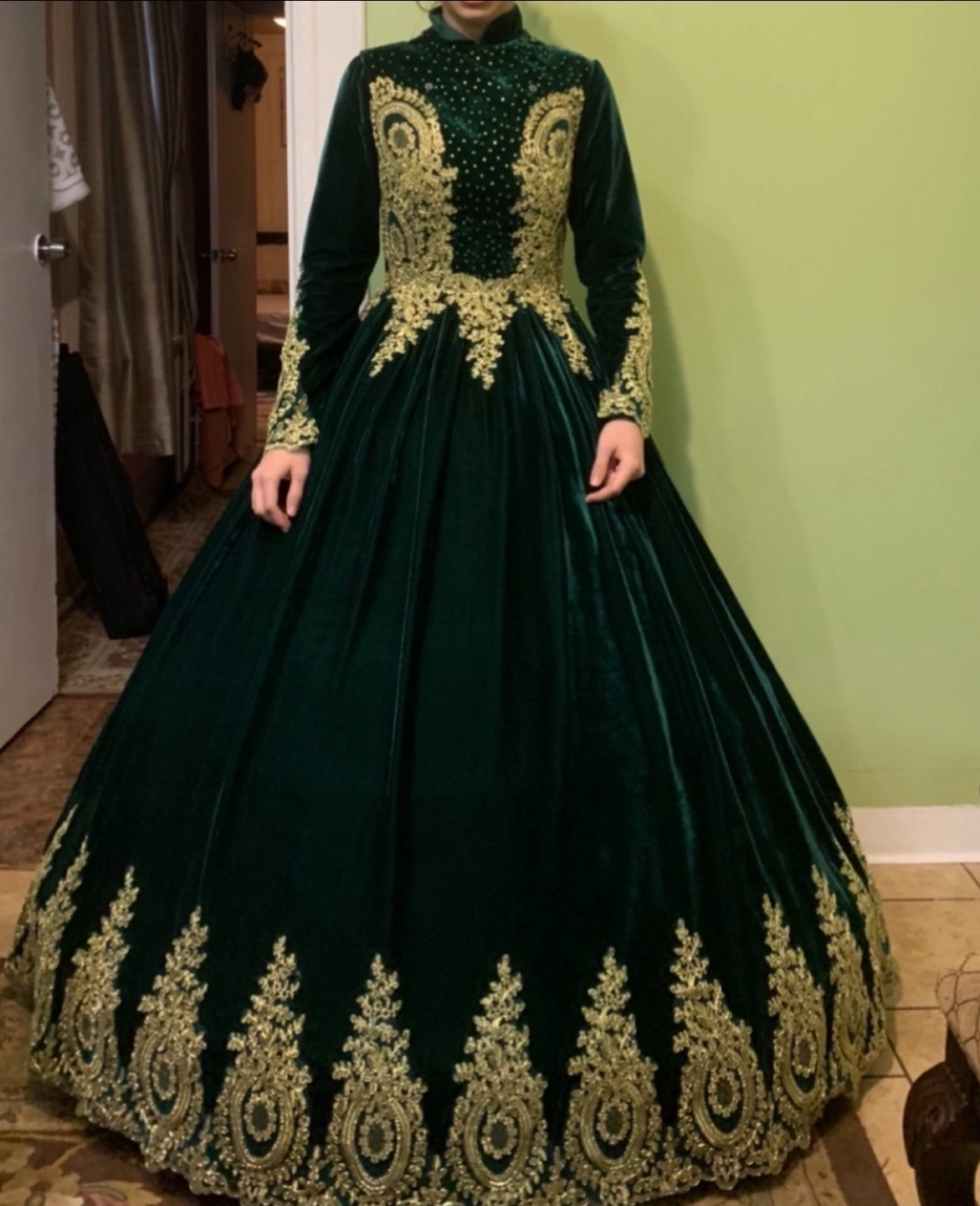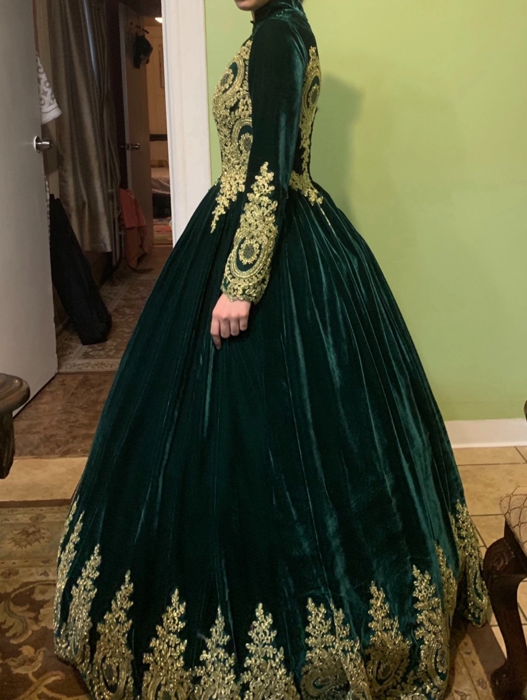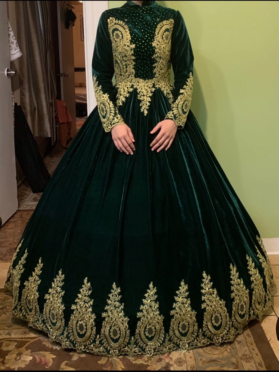 Long sleeve, green velvet dress with gold lace. Floor length, high neckline. Fitted bodice with a full skirt. In a amazing condition,never worn If you have any questions please feel free to ask..