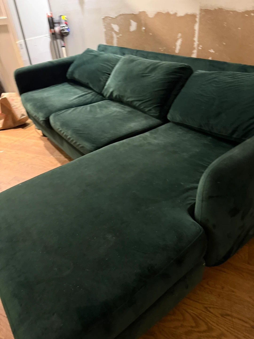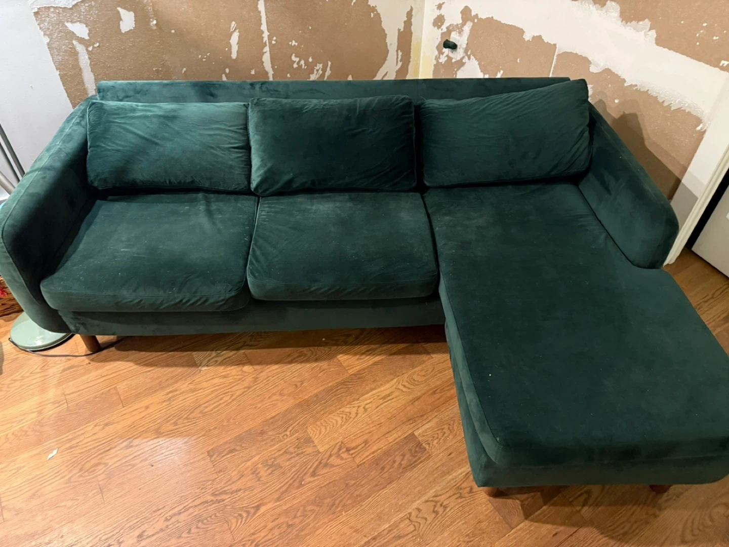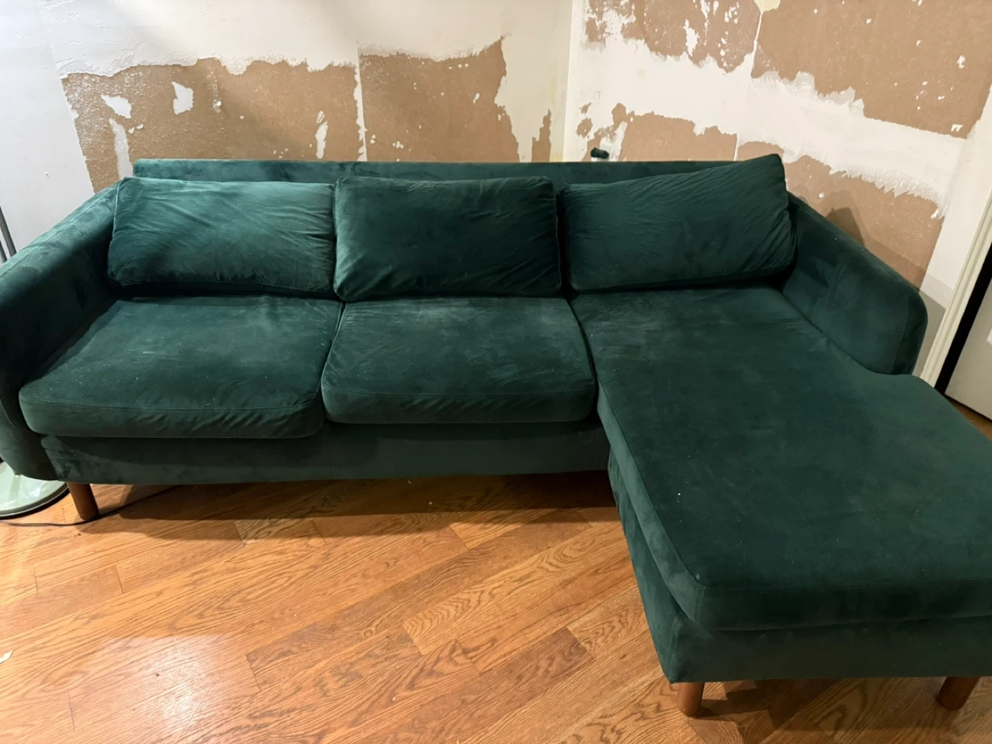 Selling a WASHABLE (all cushions covers zip off and are machine washable) green velvet sectional sofa with an ottoman. It's in good condition and perfect for a living room or den. The sectional provides seating for 3+ and the ottoman adds extra comfort and versatility. OBO Must pick up