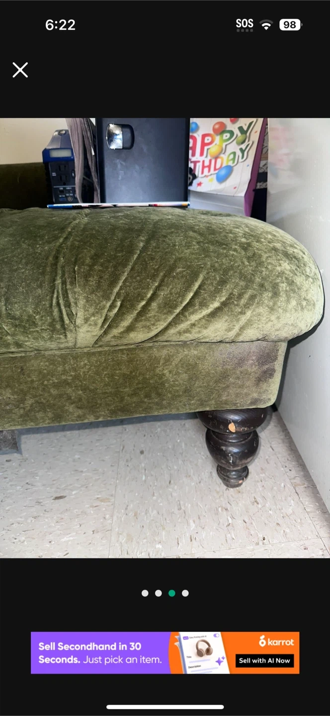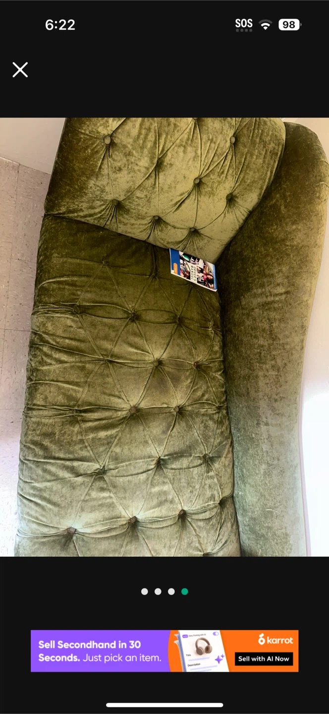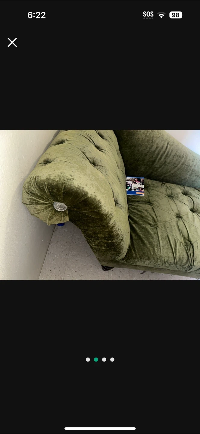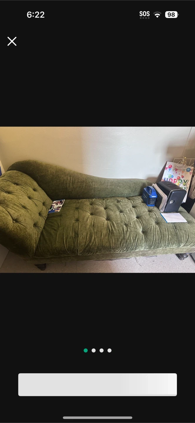 Selling a green velvet tufted chaise lounge. It's a stylish and comfortable piece of furniture that could add a touch of elegance to any room. It has some signs of use, but overall it is in good condition. Perfect for lounging and relaxing!
