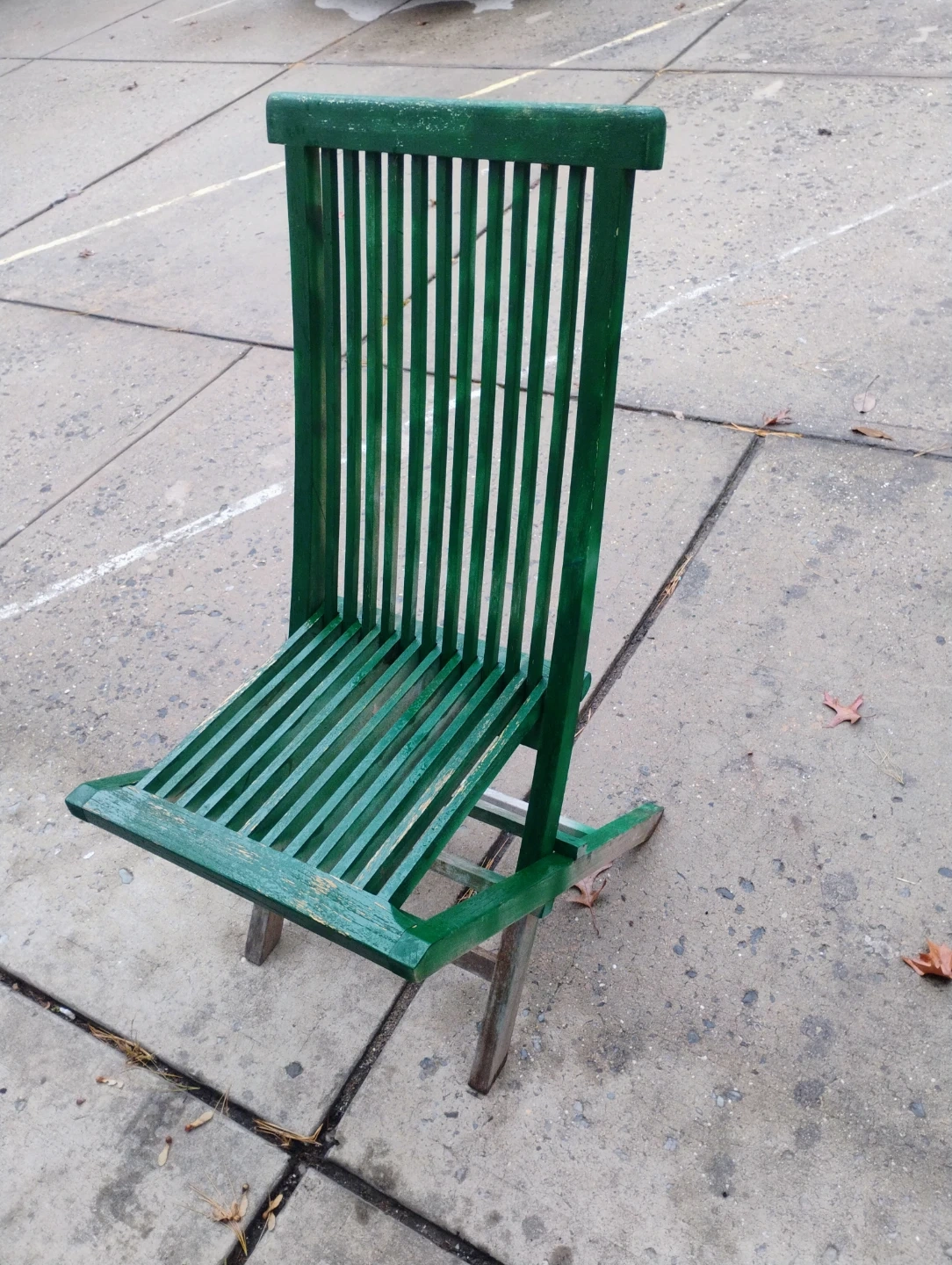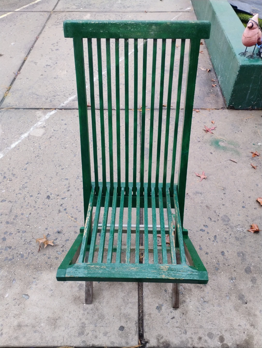 60Selling a green wooden folding chair. It shows some signs of wear, but it's still sturdy and functional. Perfect for extra seating indoors or outdoors!