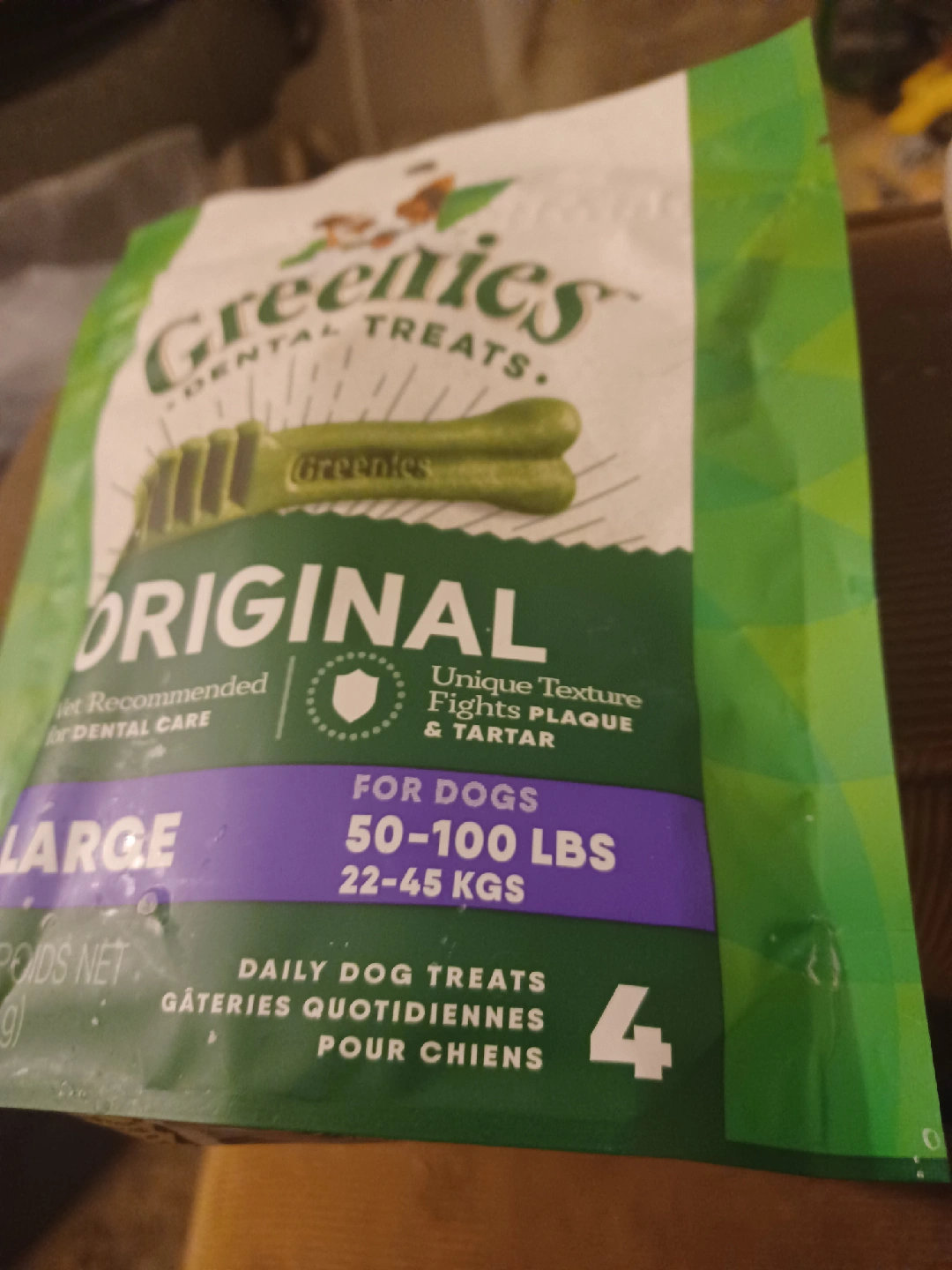Selling a bag of Greenies Original Dental Treats for dogs! These are the large size, suitable for dogs weighing 50-100 lbs (22-45 kgs). They have a unique texture that helps fight plaque and tartar, promoting dental care for your furry friend