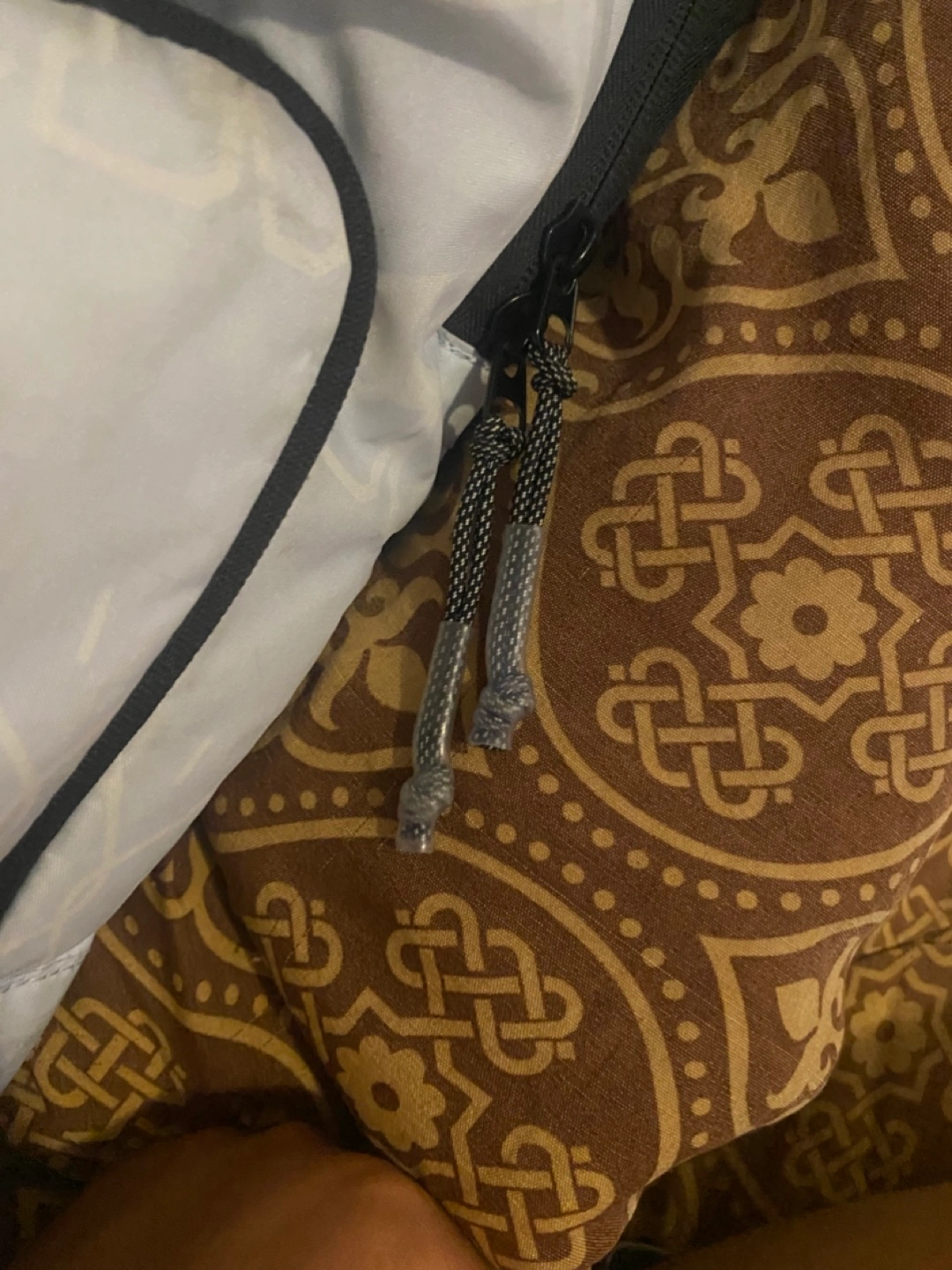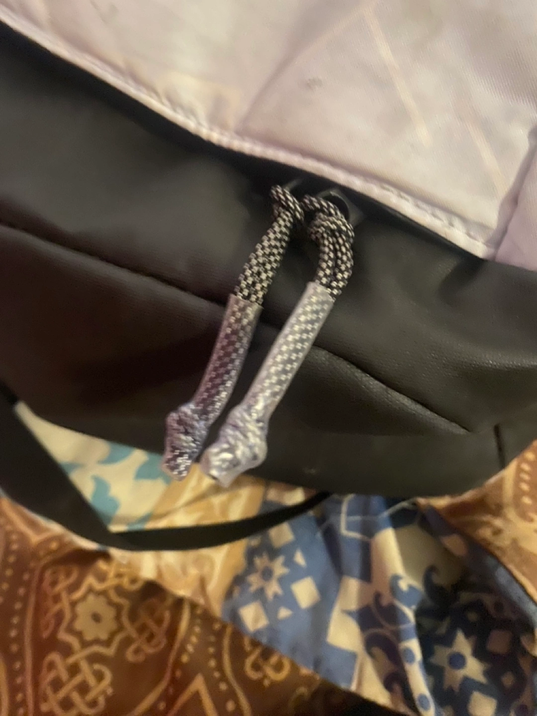 Lightweight backpack. Grey and black color scheme. Rope zipper pulls. Great for everyday use.