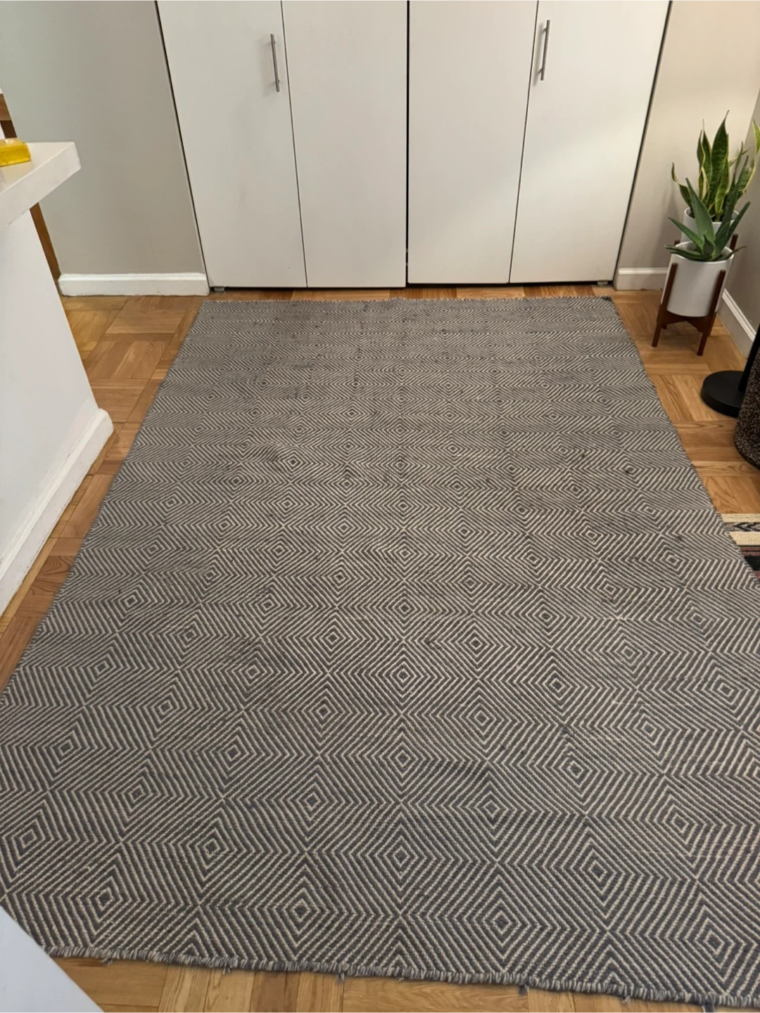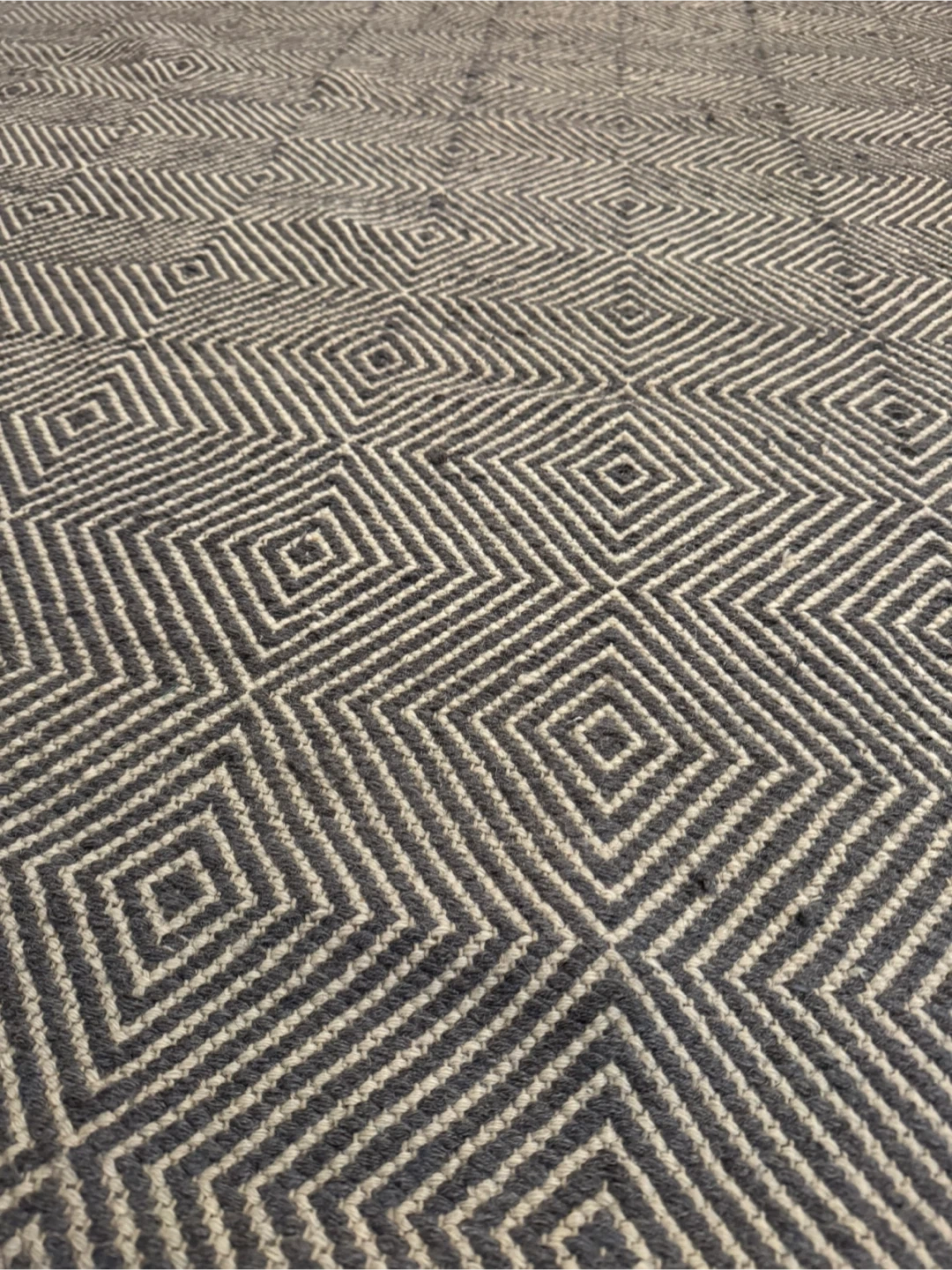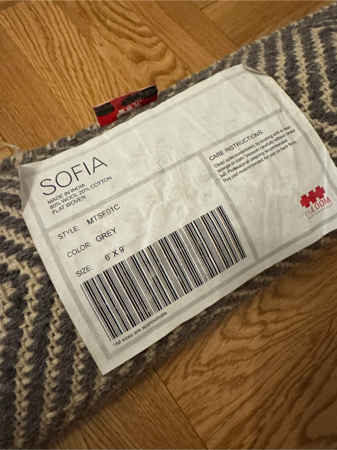 Selling grey area rug. It's 6' x 9' and made of 80% wool and 20% cotton. The style is flat woven.