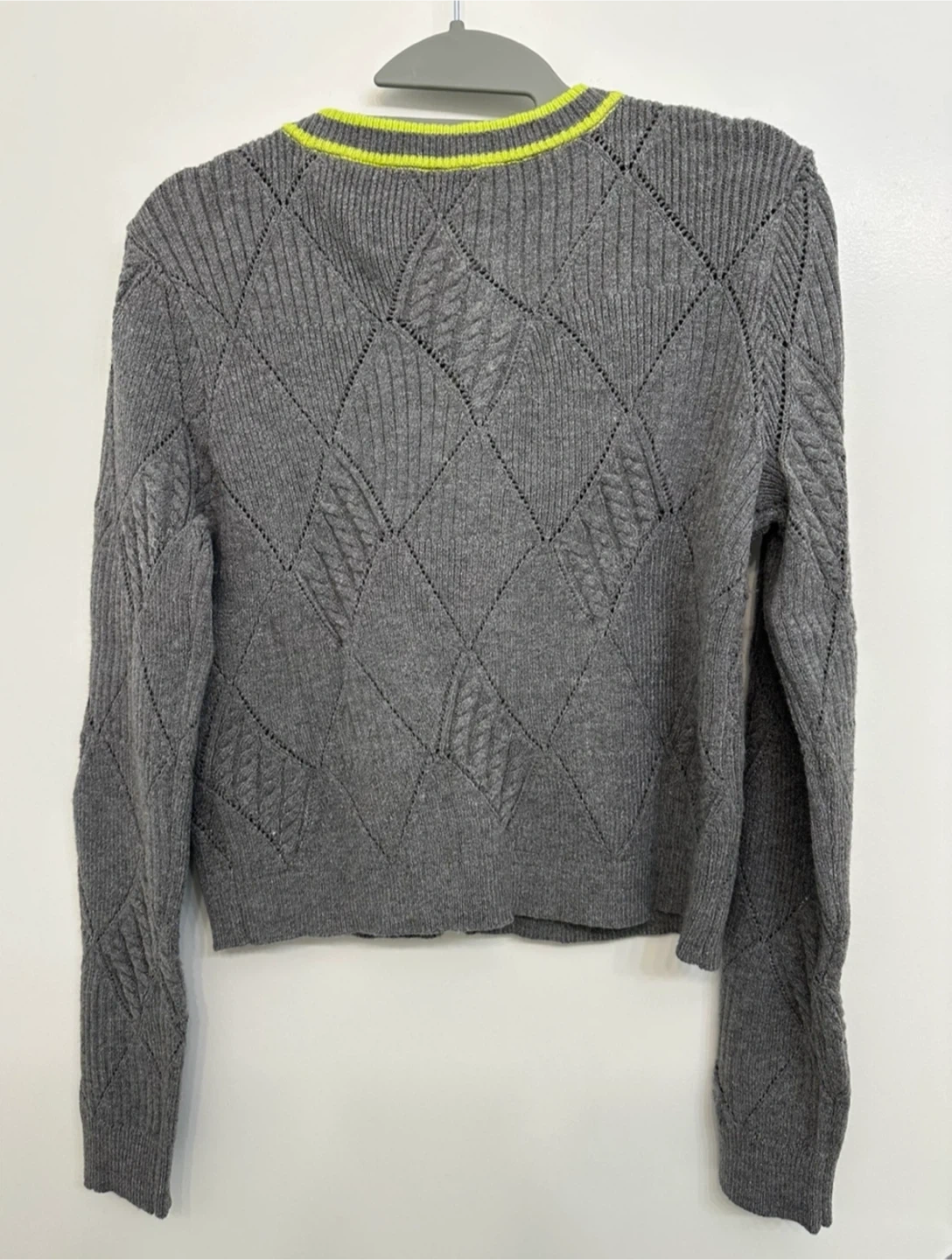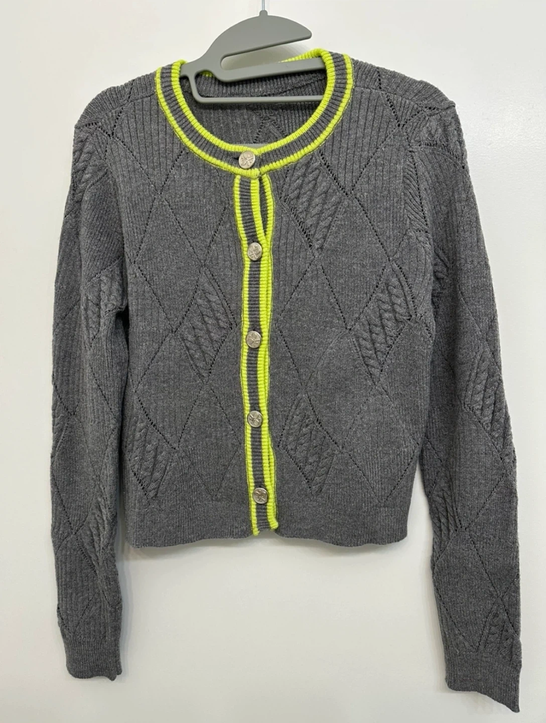 Selling a cute grey cardigan with a neon yellow trim. It's in great condition and has a unique diamond pattern. The material is soft and comfortable, perfect for layering!