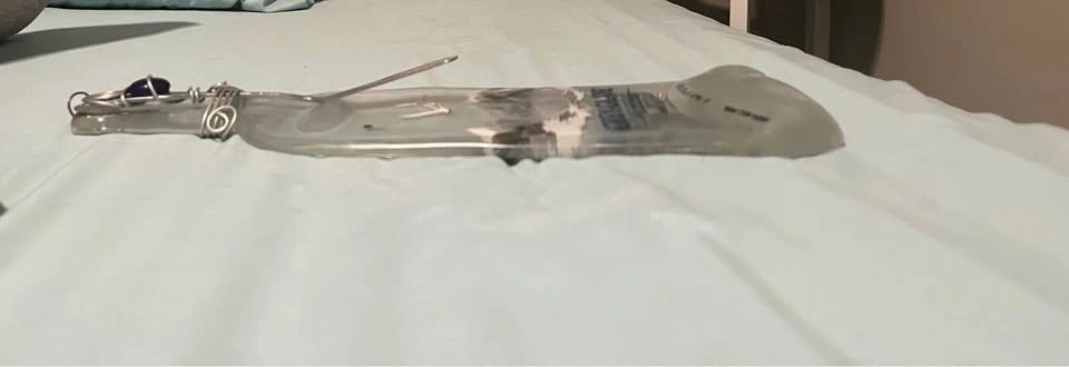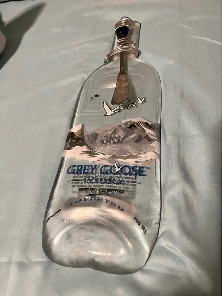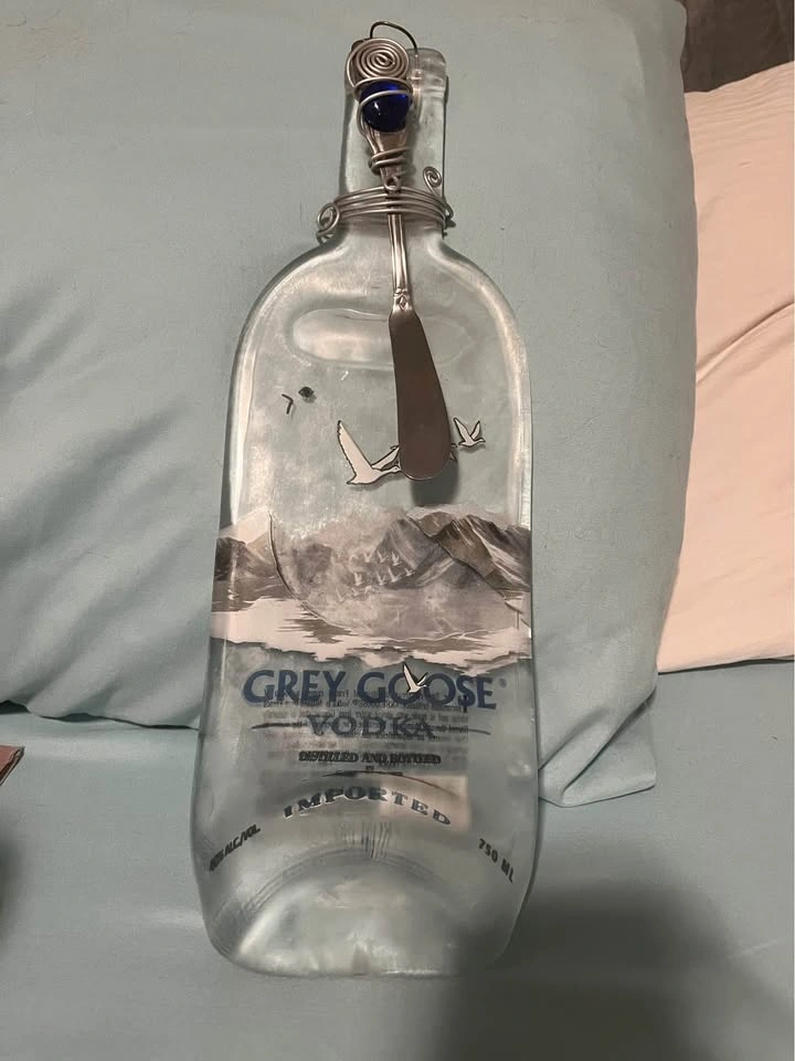 Flattened glass Gray Goose bottle that comes with a cheese knife and can be used as a charcuterie board or hung up as wall decor.