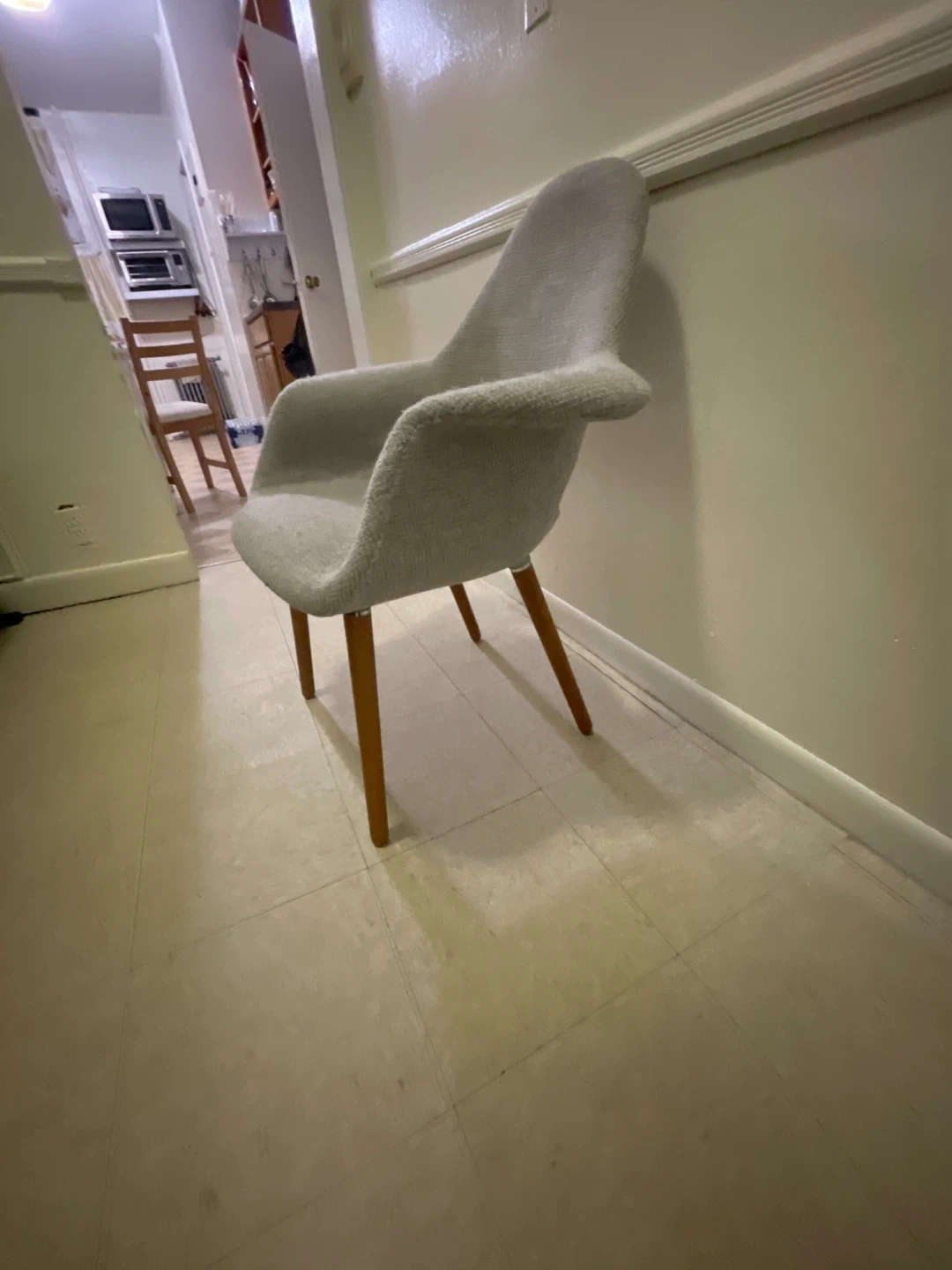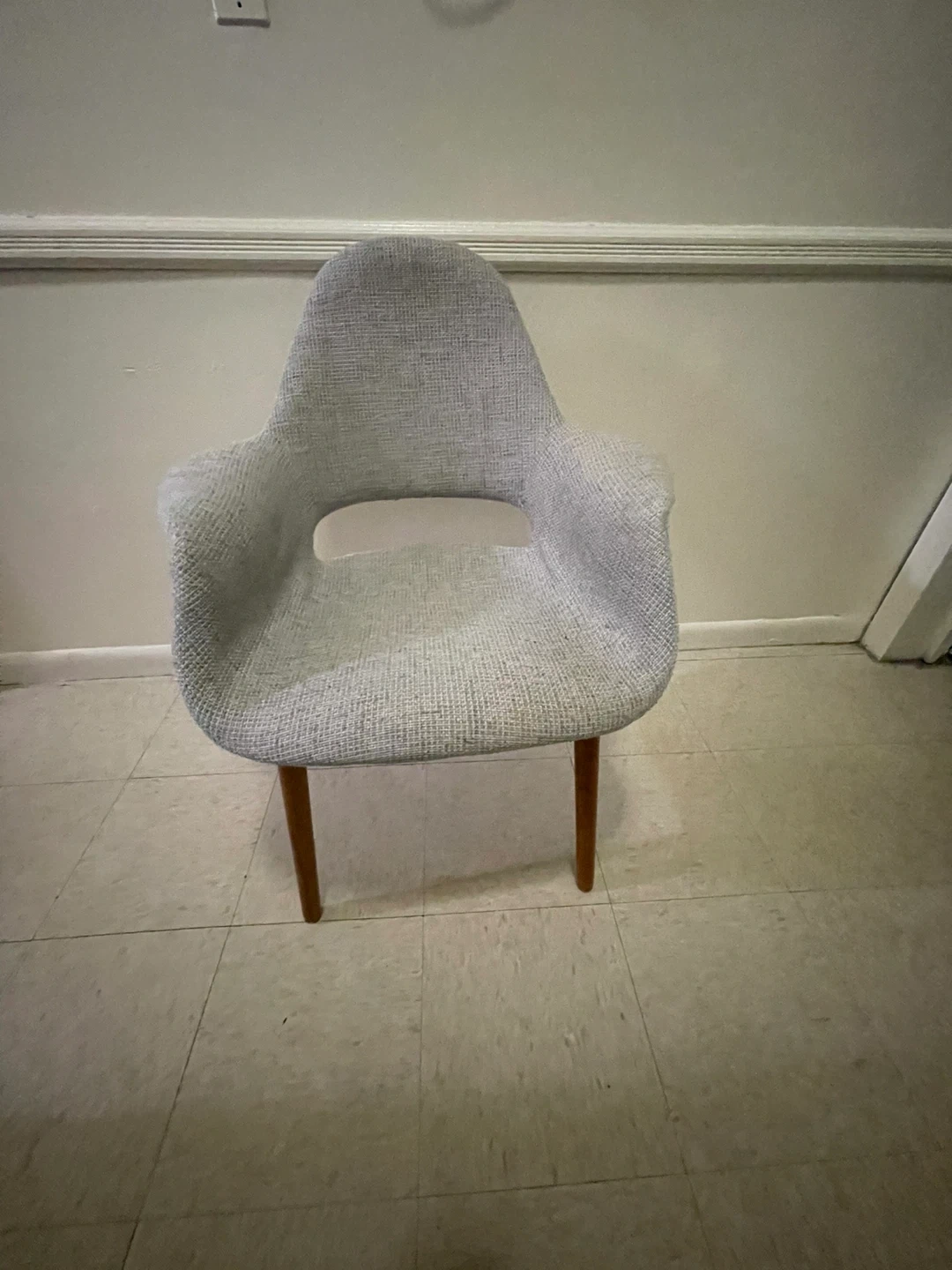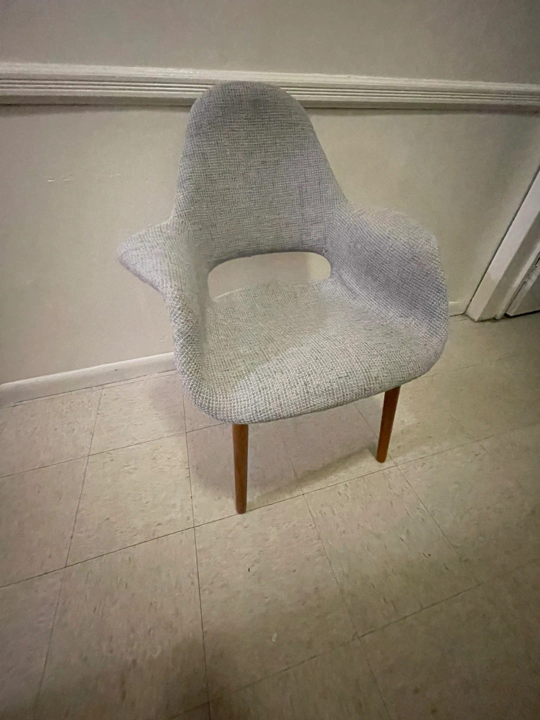 10Selling a stylish mid-century modern armchair! It features a comfortable, curved back and armrests, perfect for adding a touch of retro charm to your home. The chair has a light grey fabric upholstery and sturdy wooden legs.