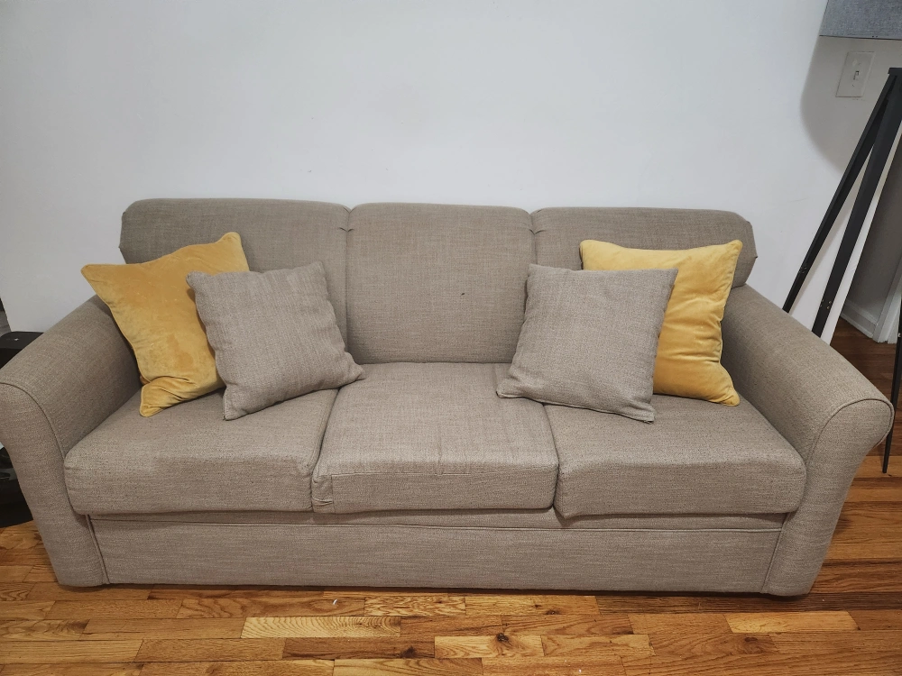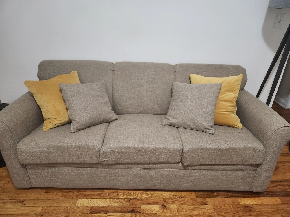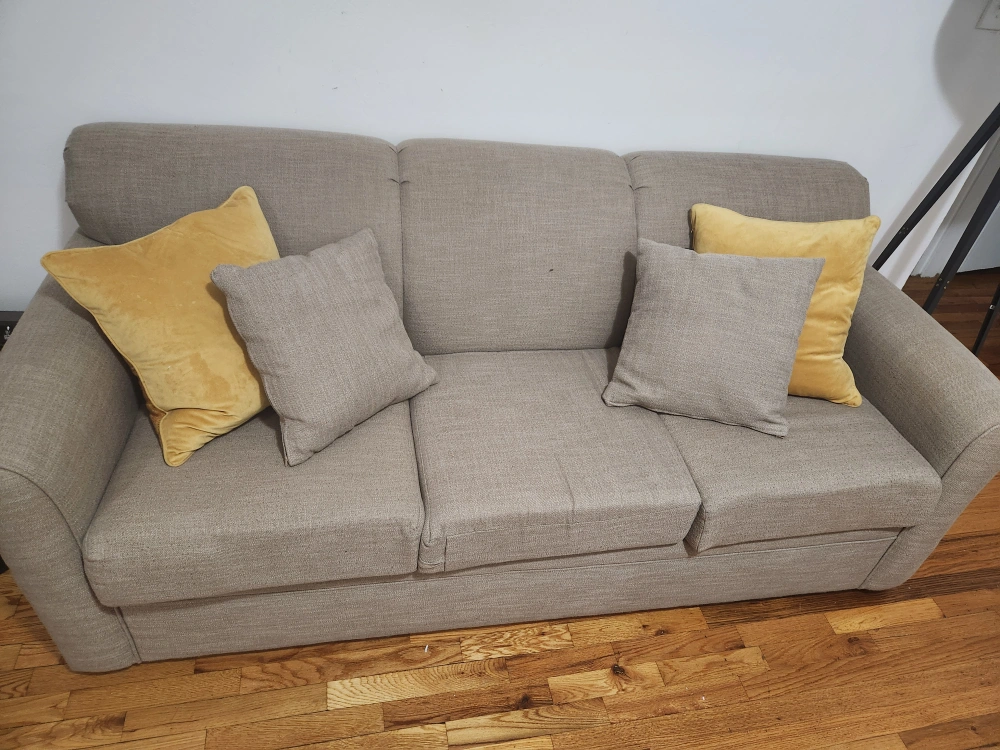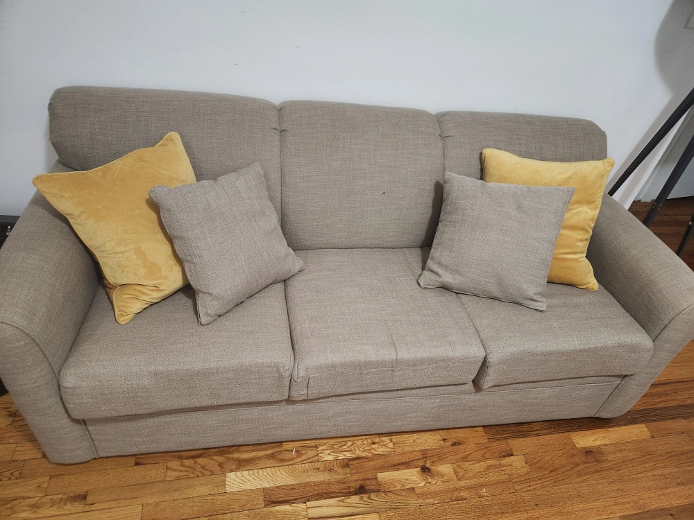 A classic grey sofa with a plush seat and back. This sofa has been used but is in decent condition. It is perfect for a living room or den.