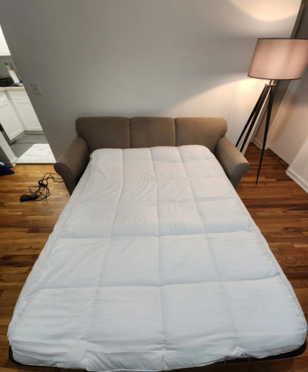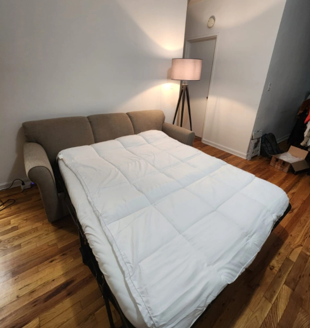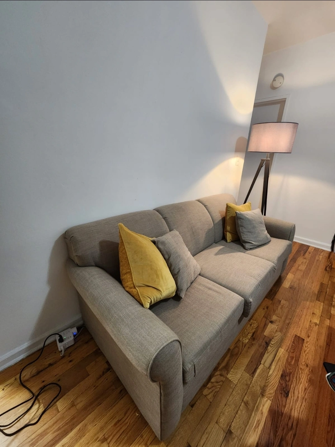 A classic grey sofa with a plush seat and back. This sofa has been used but is in decent condition. It is perfect for a living room or den.
