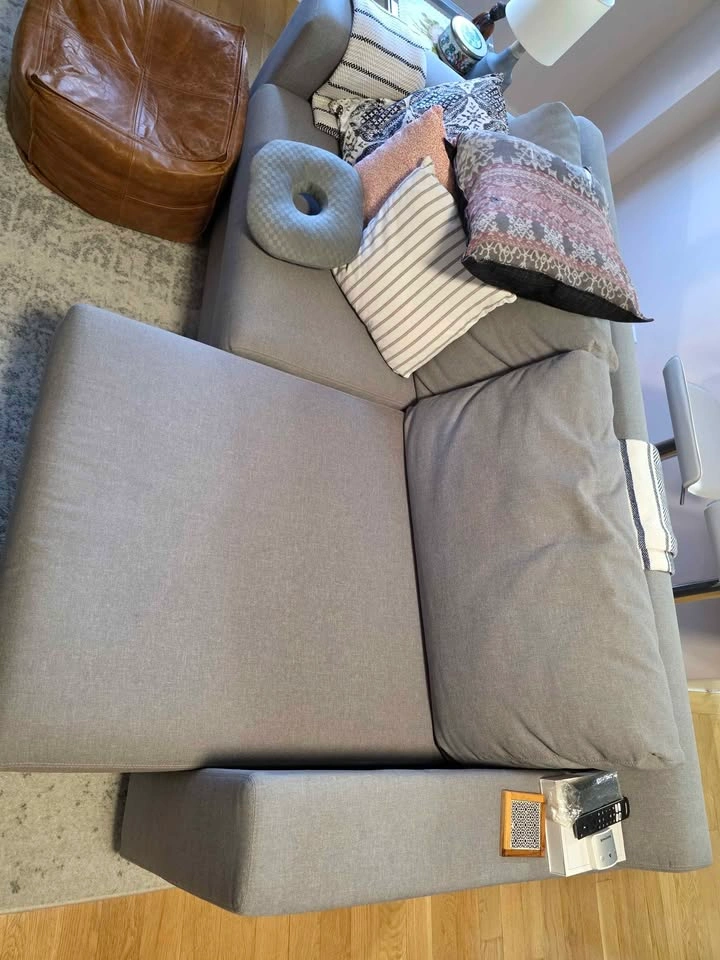 10Dimensions: 77 x 36 inches Amazing comfy couch. The seats pull out and make a great sleeping space. No stains or damages