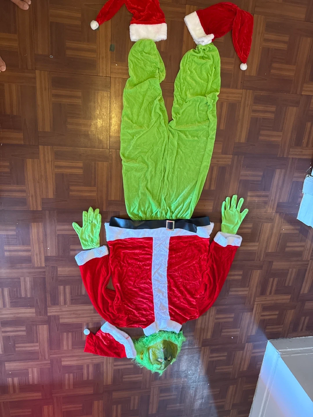 60Selling a Grinch costume! It includes everything you need to become the Grinch - the green pants, red and white jacket, gloves, and mask