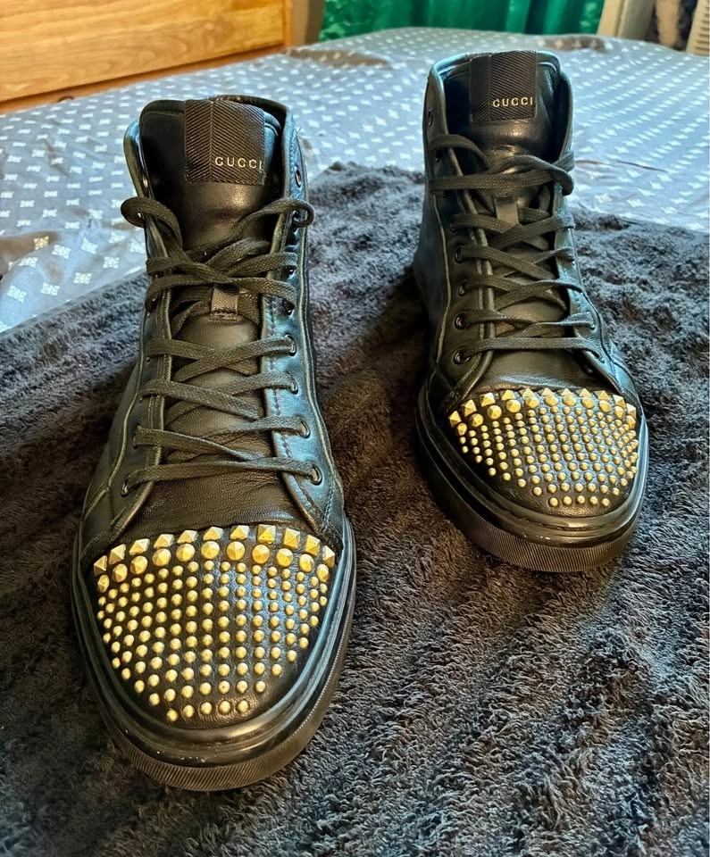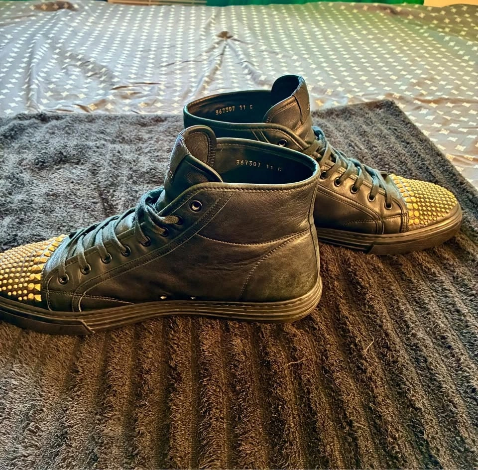 Gucci Men’s Sneakers – Size 11. Luxury black leather sneakers with gold metal studs. Condition: Like New – lightly used, barely worn. Comfortable, stylish, and authentic Gucci. Size 11 (Men). Material: Premium Leather with Gold Stud Detail. Rare piece, selling because I don’t use them anymore. Local pick up in the Bronx. HABLO Español.