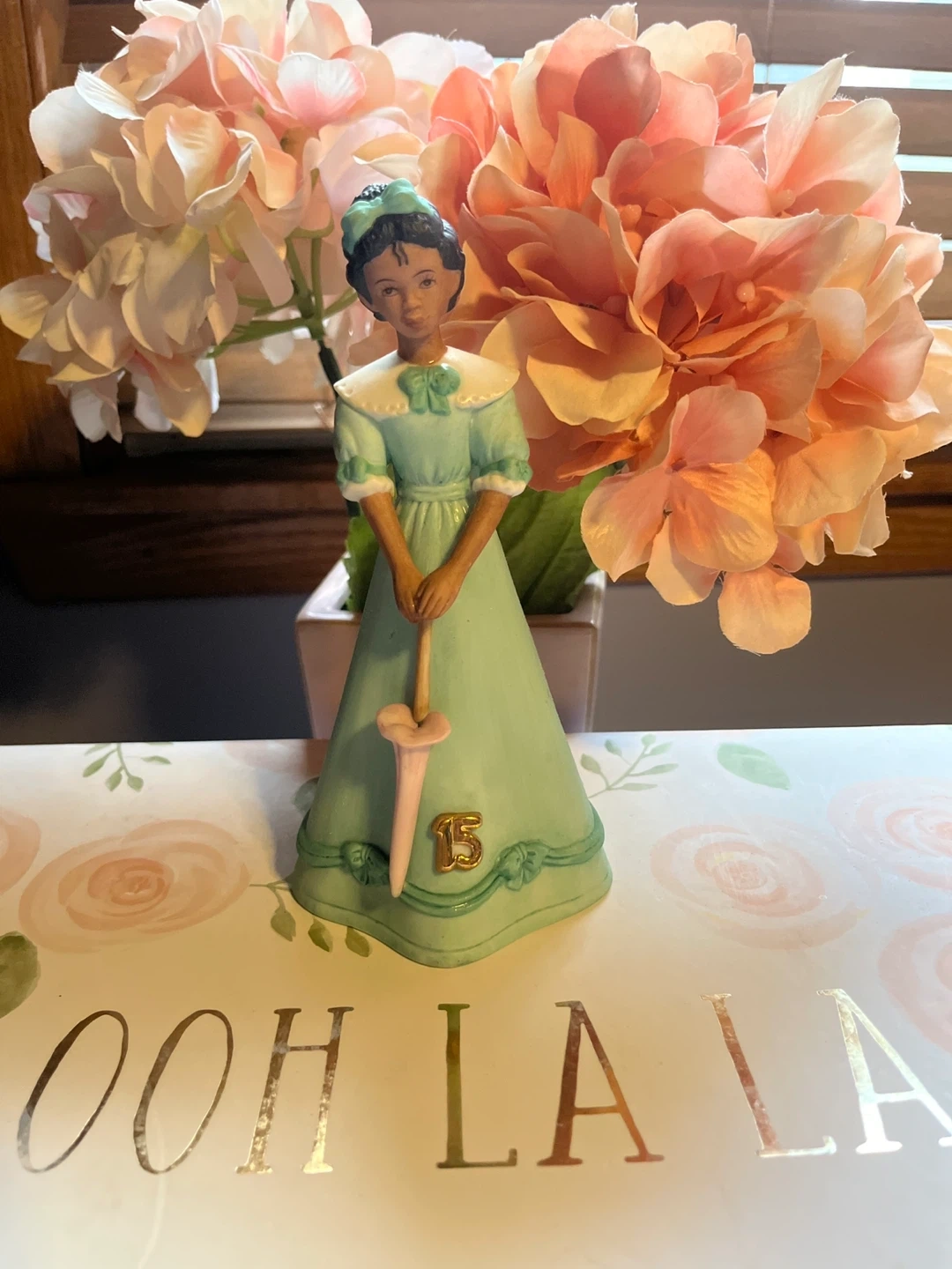 This is a lovely "Growing Up Birthday Girls" figurine, perfect for celebrating a 15th birthday! The figurine is in great condition and features a girl in a light green dress holding a pink umbrella. It's a sweet collectible item!