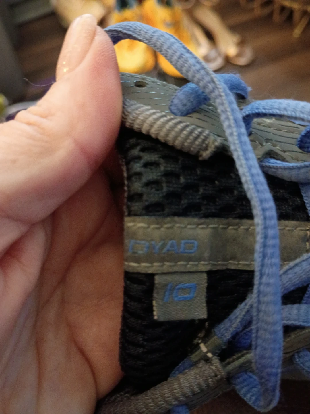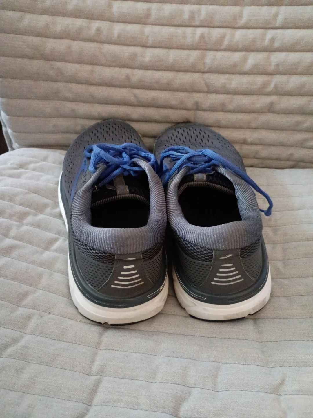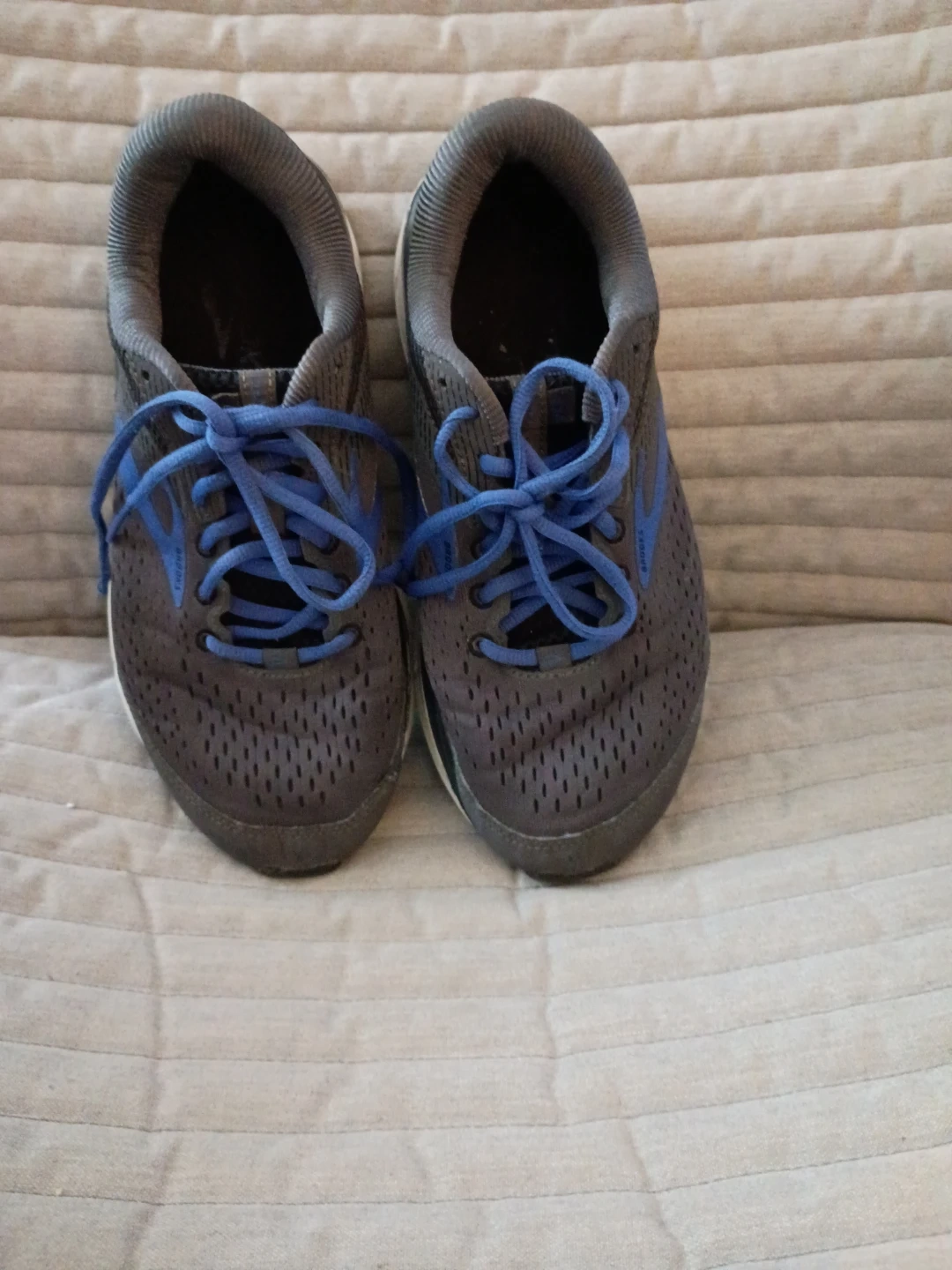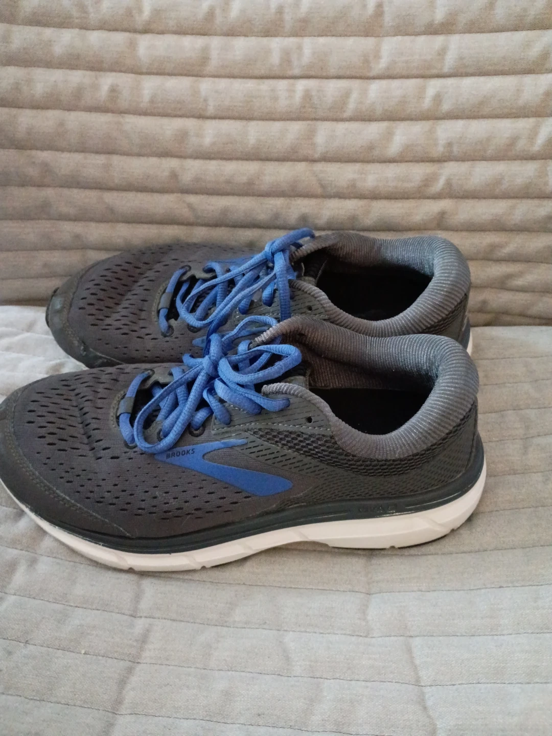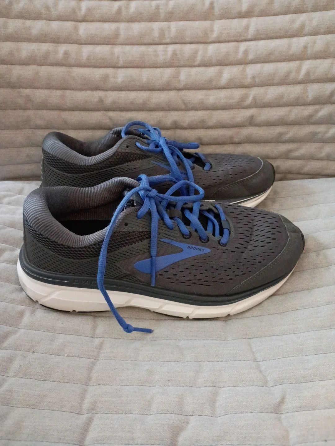 Selling a pair of Brooks Dyad 10 running shoes. They are gray with blue accents and are a size 8. They're in good condition and ready for a new owner!