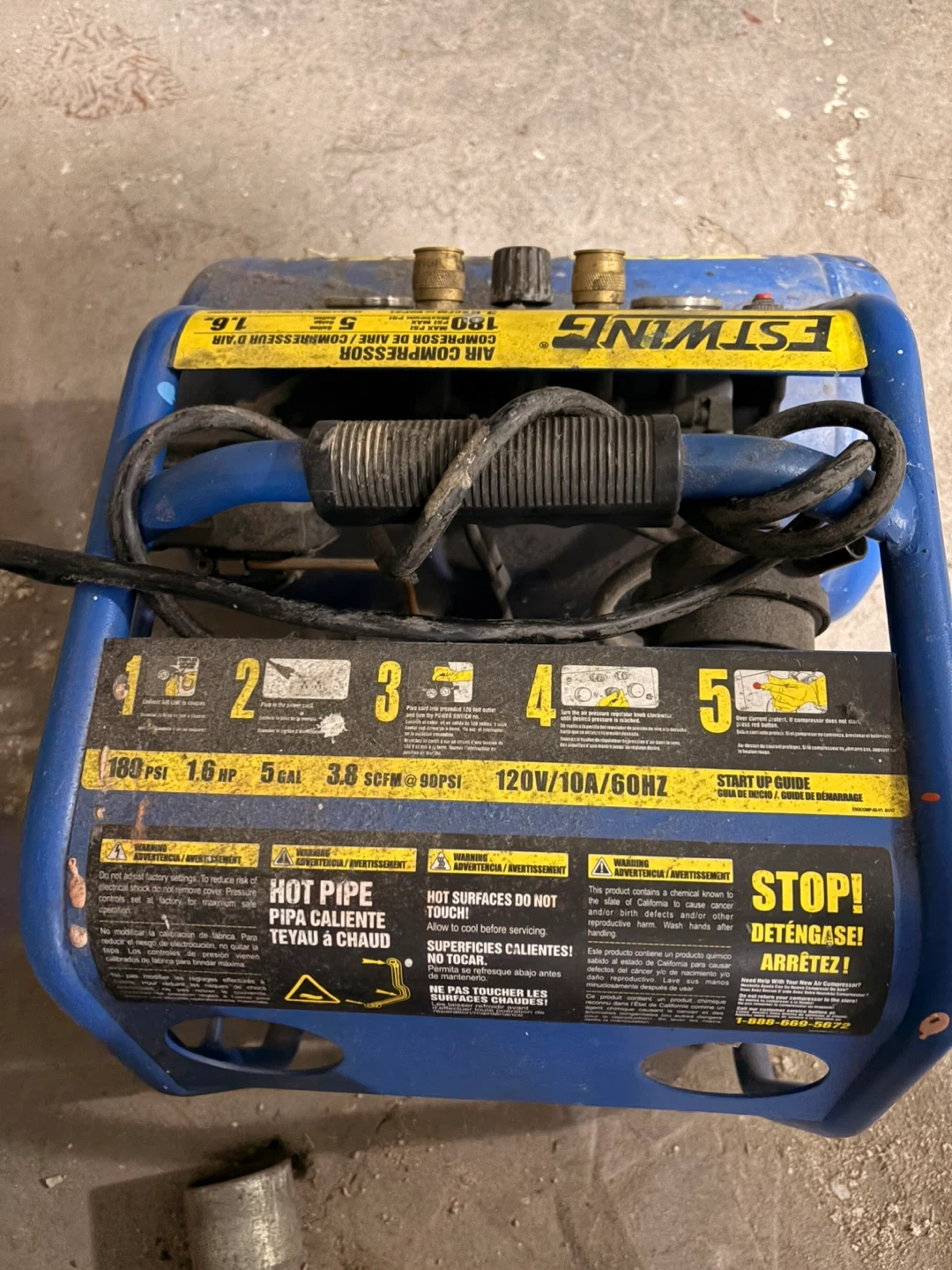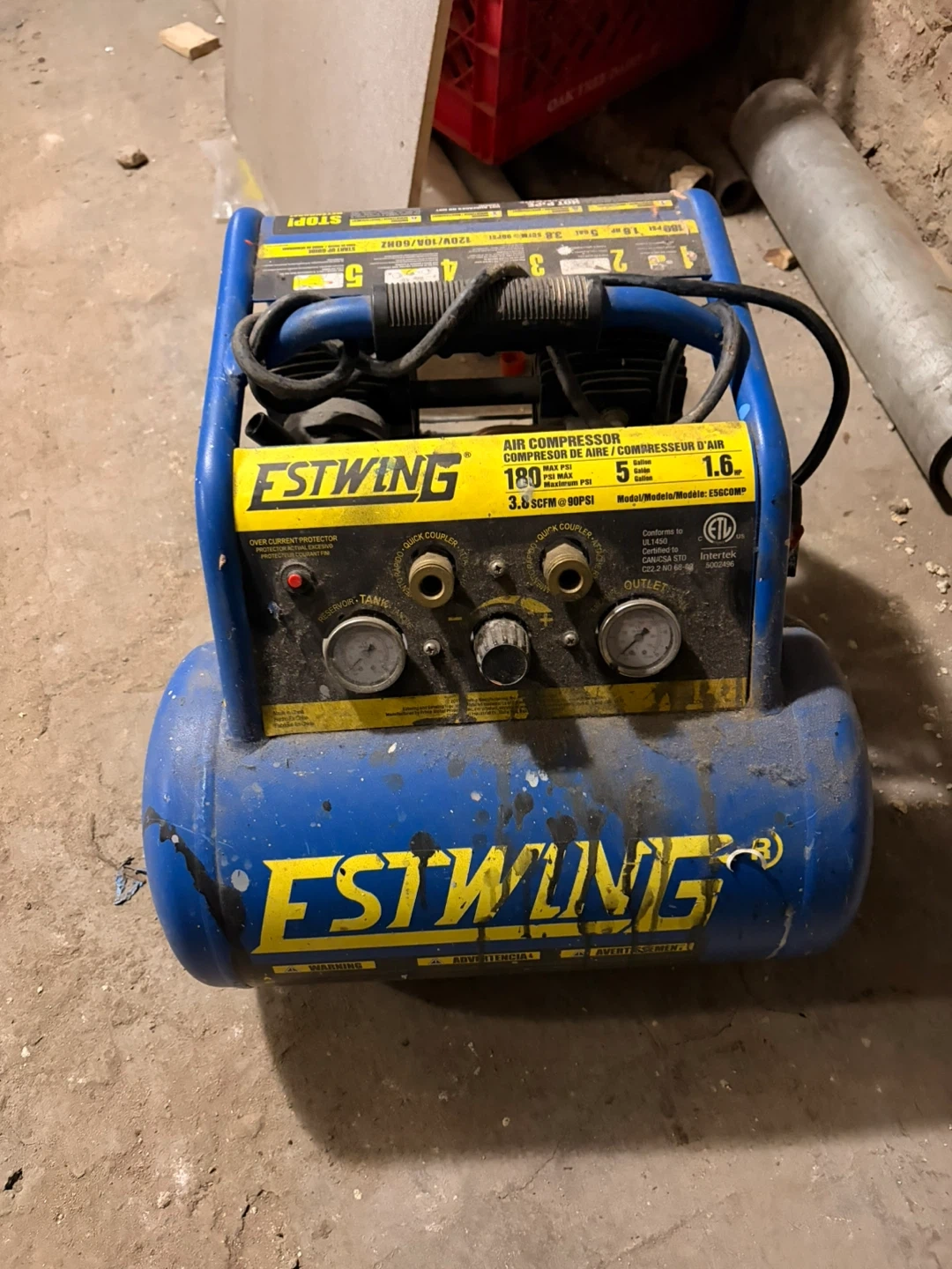 This is an Estwing air compressor with a 1.6 HP motor and a 5-gallon tank. It operates at 120V, 10A, 60Hz and can reach up to 185 PSI. The unit delivers 3.8 SCFM at 90 PSI. This compressor is suitable for various air-powered tool applications.
