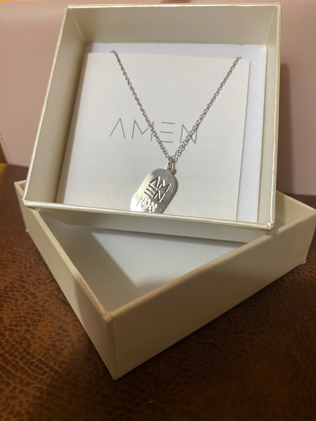 Amen necklace in a gift box. Features a silver-tone chain with a pendant. Pendant has 'AMEN' etched on it with a small decorative element below.