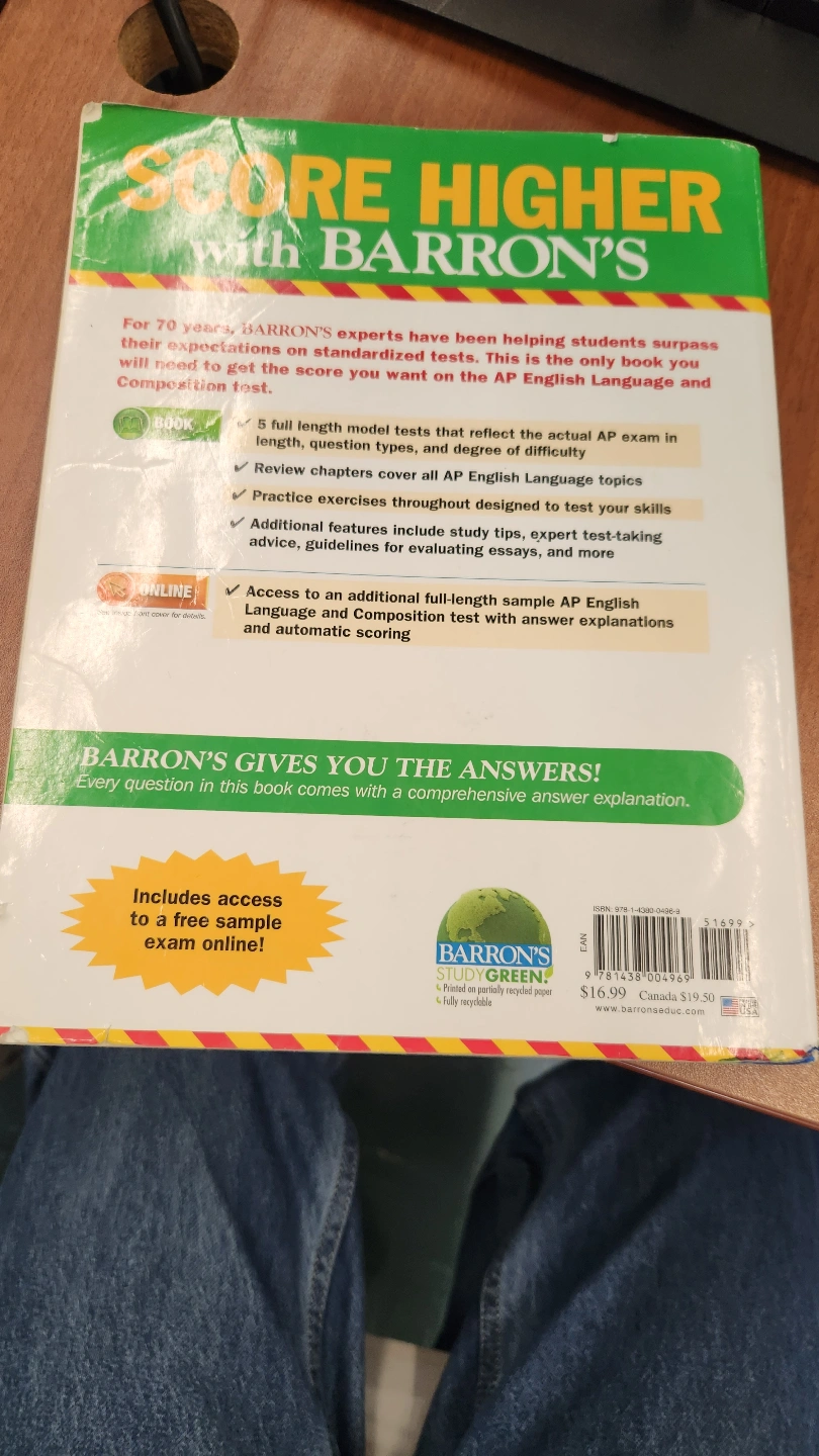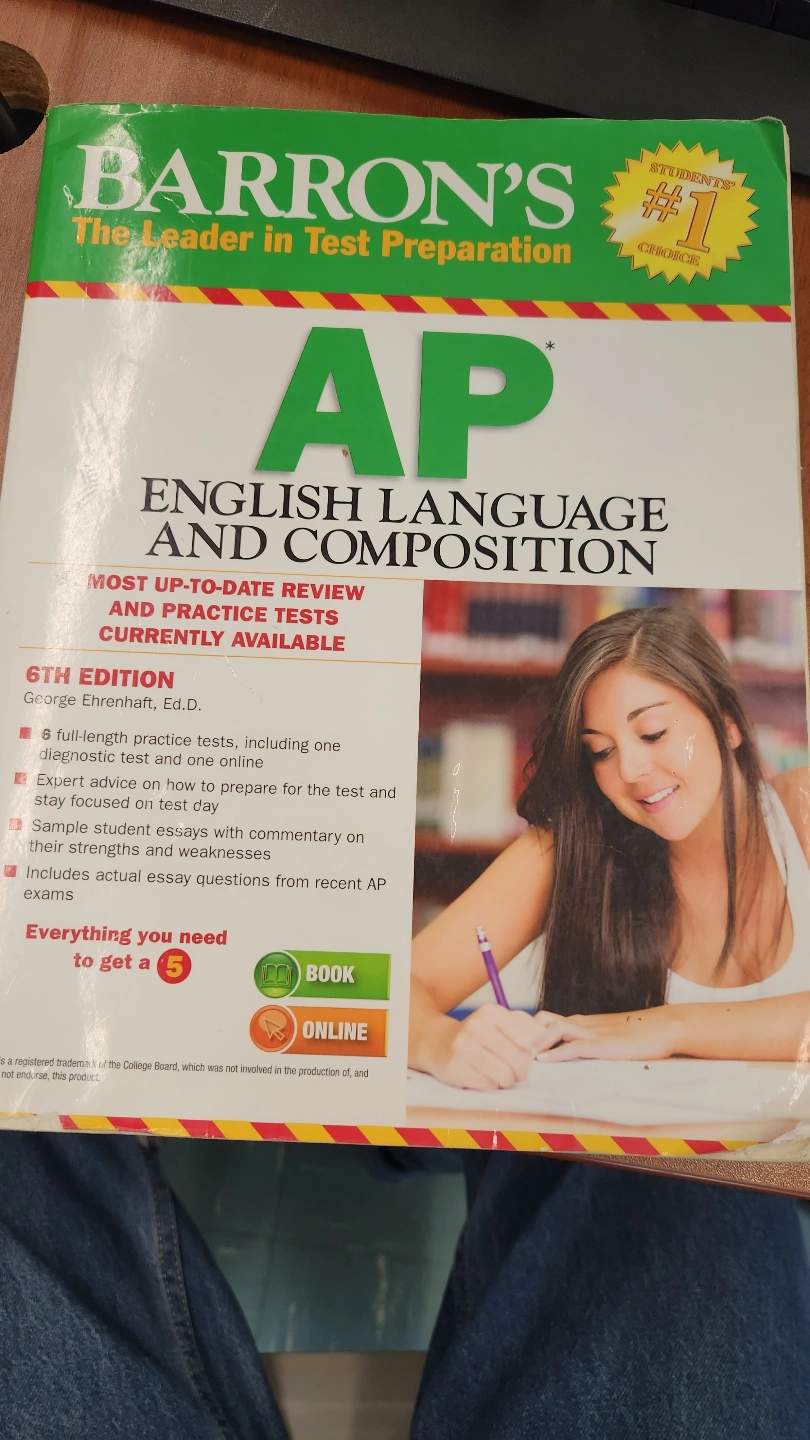 Barron's AP English Language and Composition 6th edition textbook. Includes 8 full-length practice test, diagnostic test, and online access
