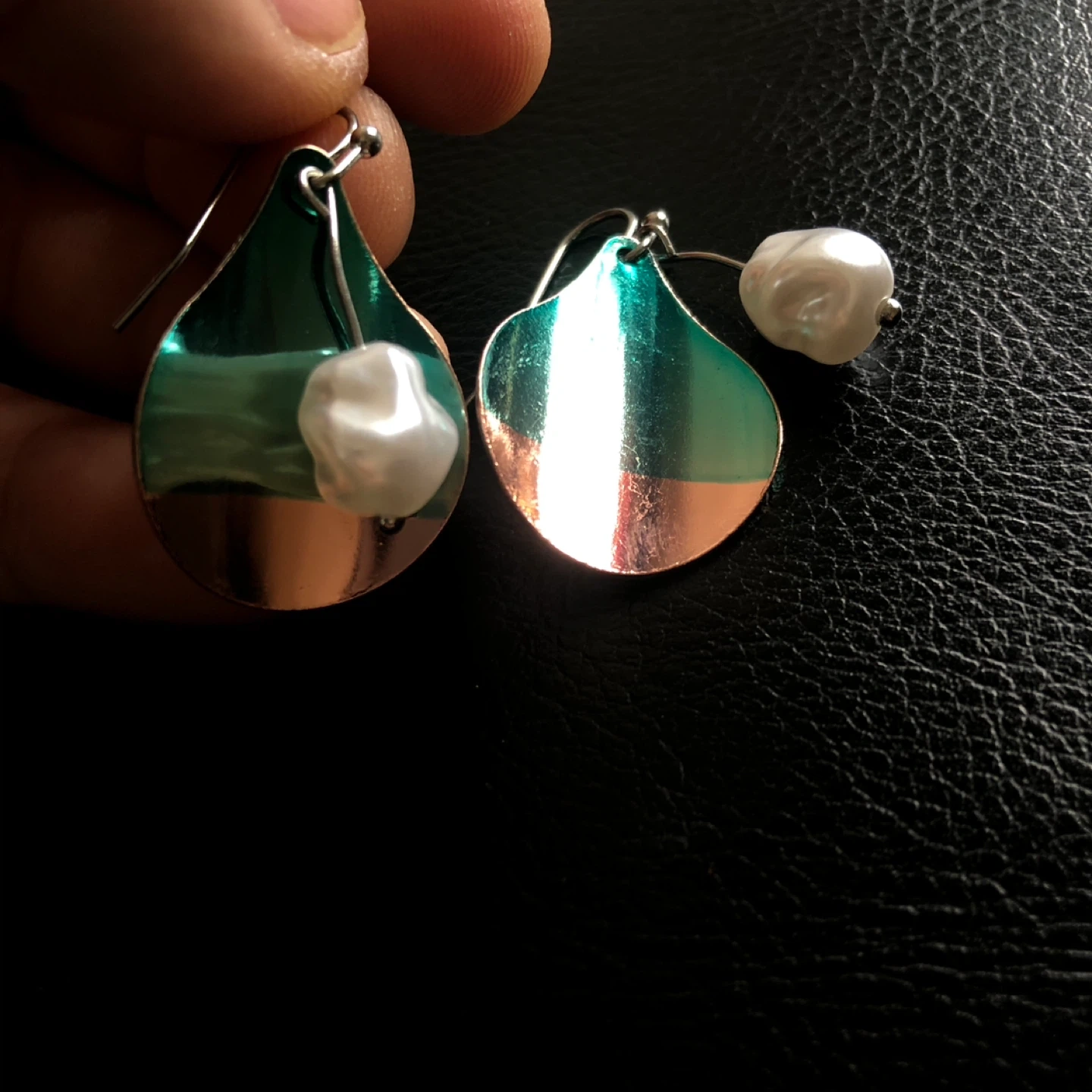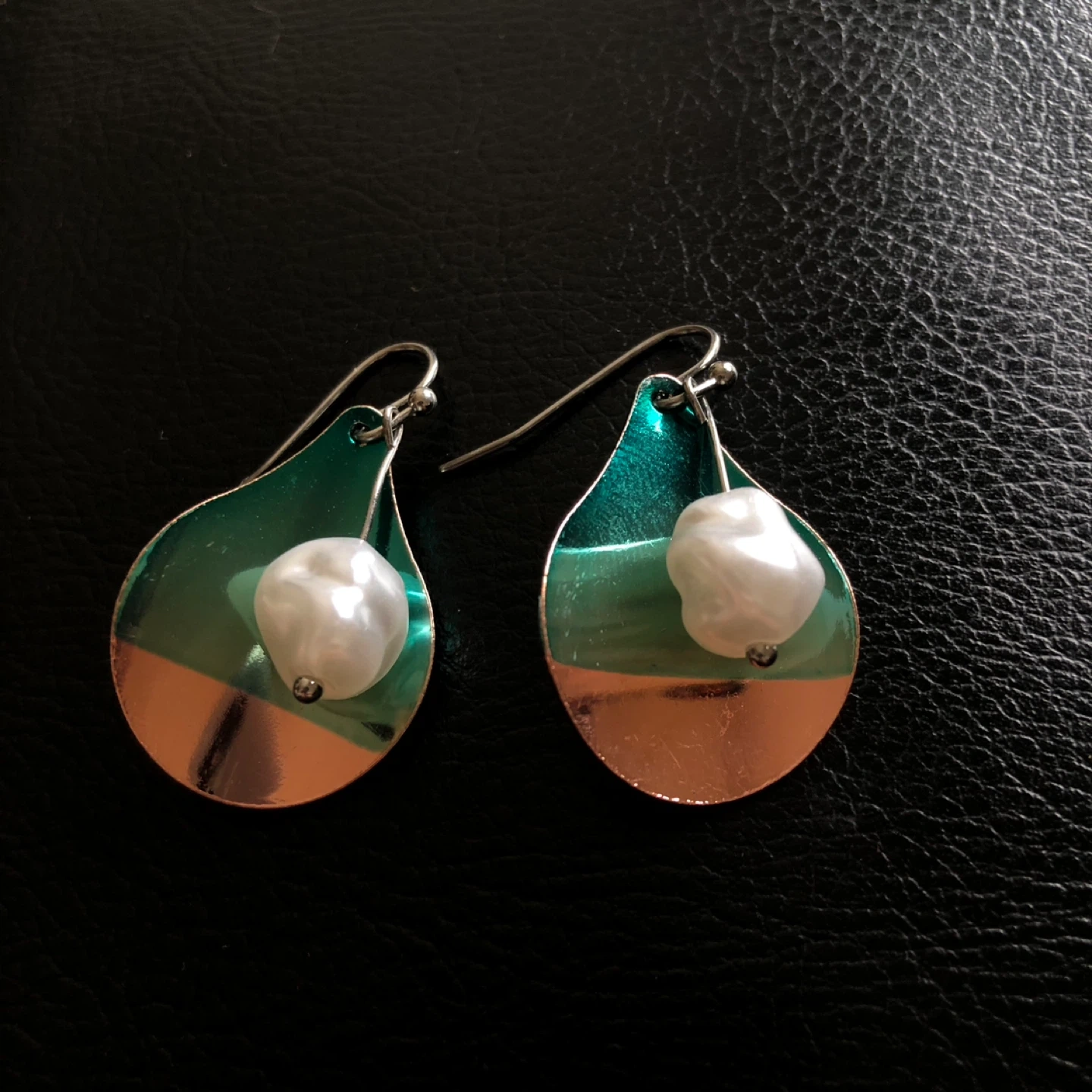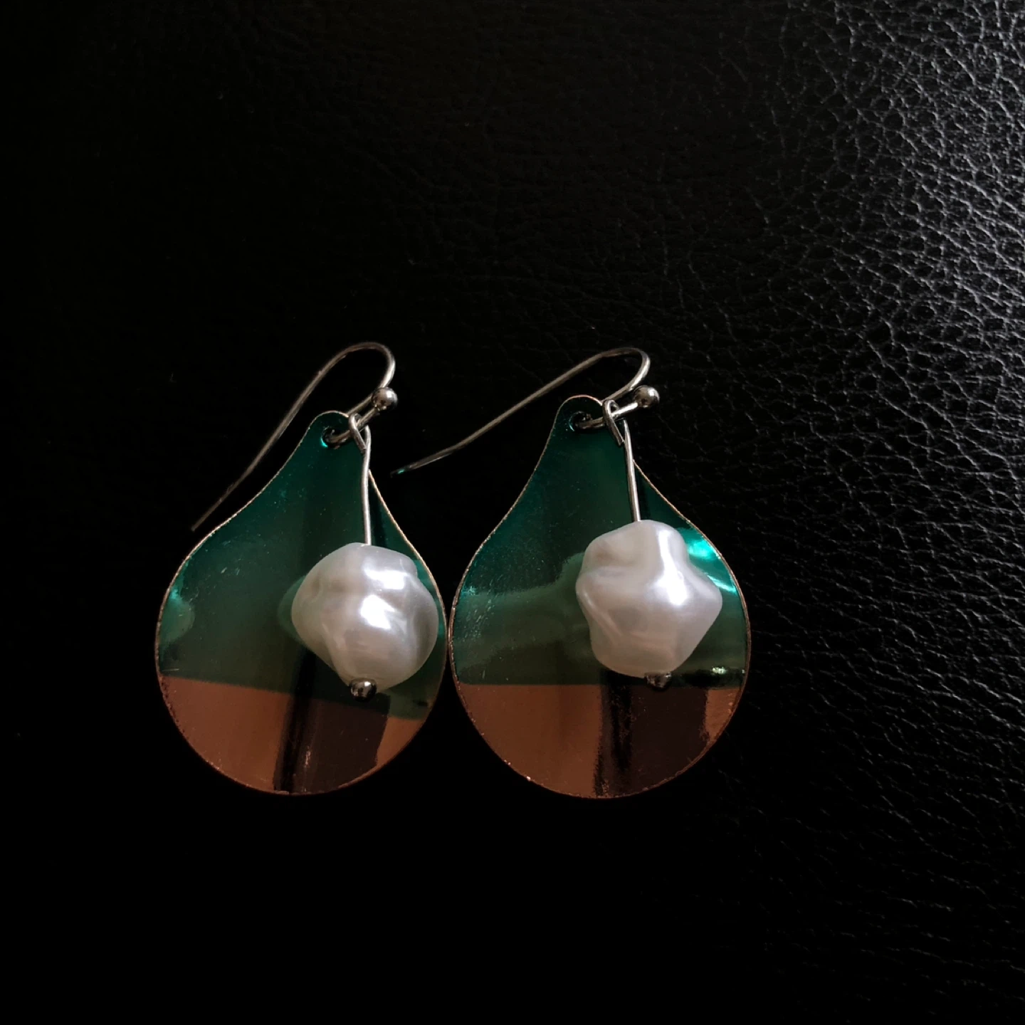 Shiny metal teardrop earrings with unique baroque pearls. These earrings feature a metallic green and copper color combination. The hooks are silver-toned metal.
