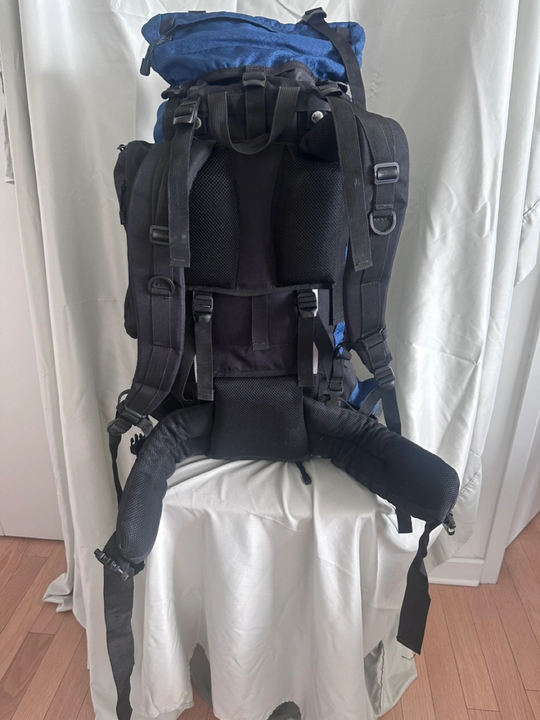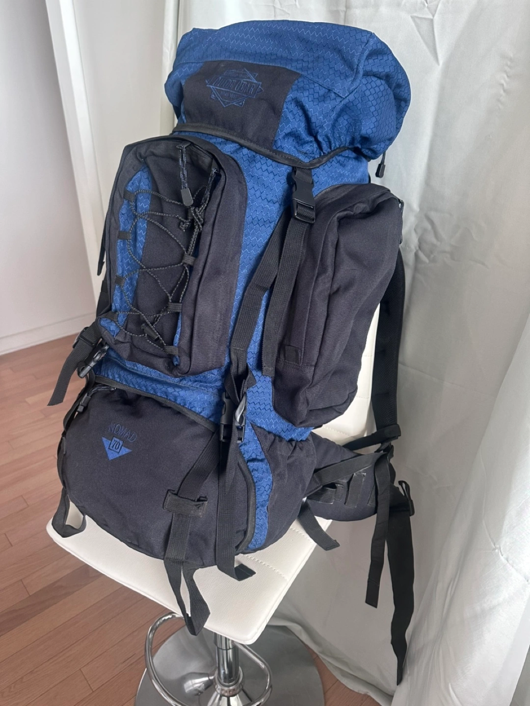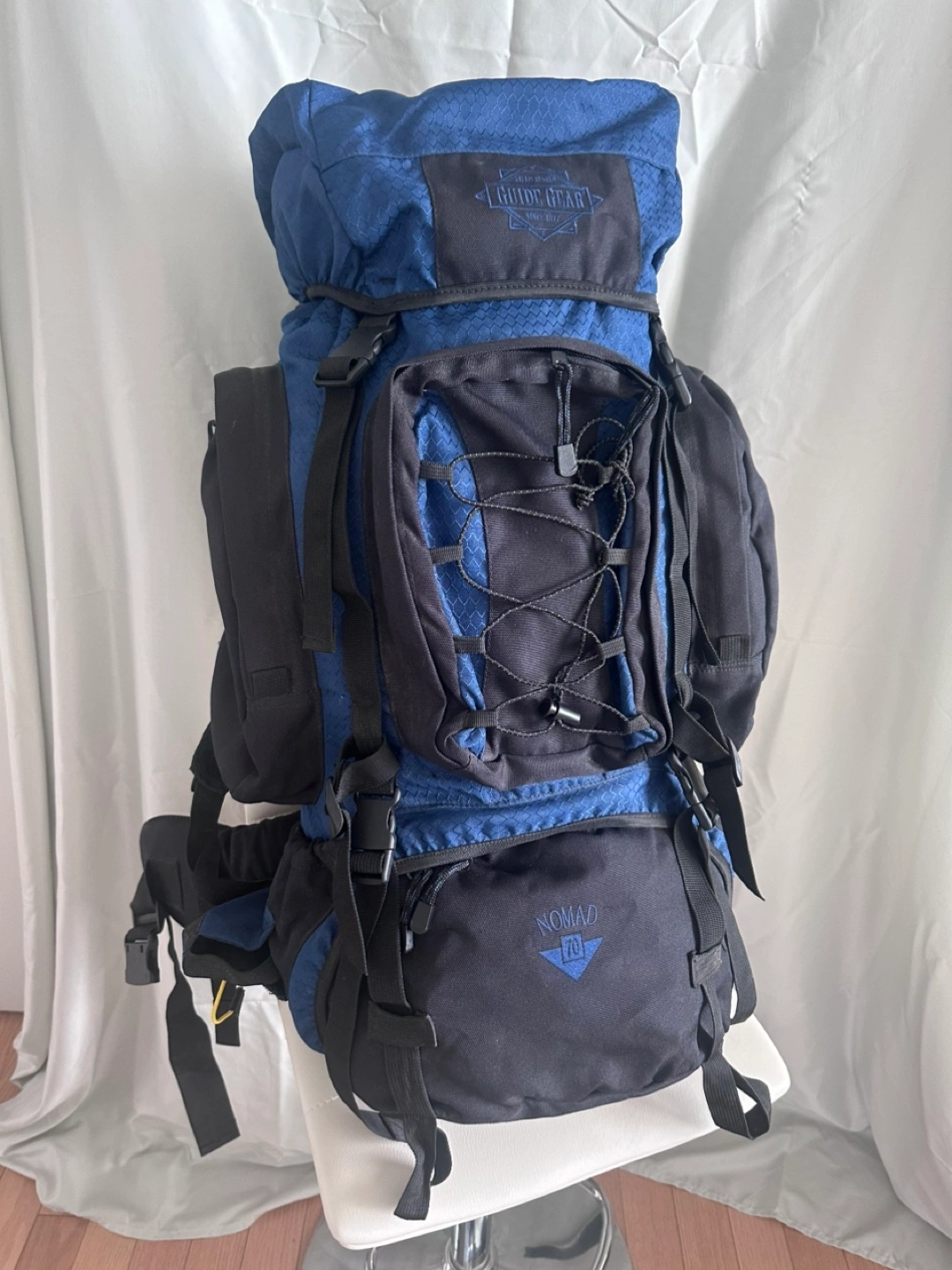 Selling a Guide Gear Nomad 70 liter hiking backpack. This backpack is perfect for your next outdoor adventure ! It features a blue and black color scheme, and multiple compartments for storage. Ready for a new owner and new excursions !