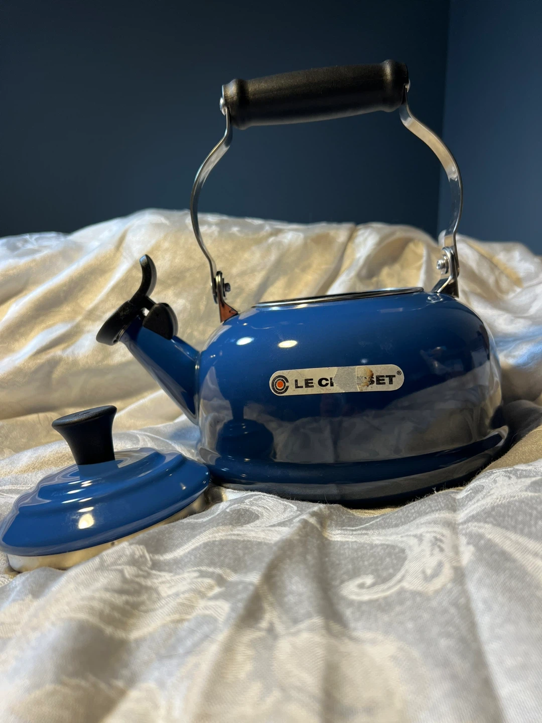 Le Creuset kettle in a beautiful blue enamel finish (Marseille). It's in great condition and ready to heat up your water for tea or coffee. It has never been used, so its “Whistle While You Work” capabilities remain untested. However, the stickers are not in the best of shape. If you are trying to impress your mother-in-law with a brand spanking new out of the box Le Creuset item for the holidays this year…you may need to do some sticker repair…and find a box. The kettle itself is in lovely condition. I only put “like new” because there is no box and the stickers are in their grunge phase. Public meet up only.