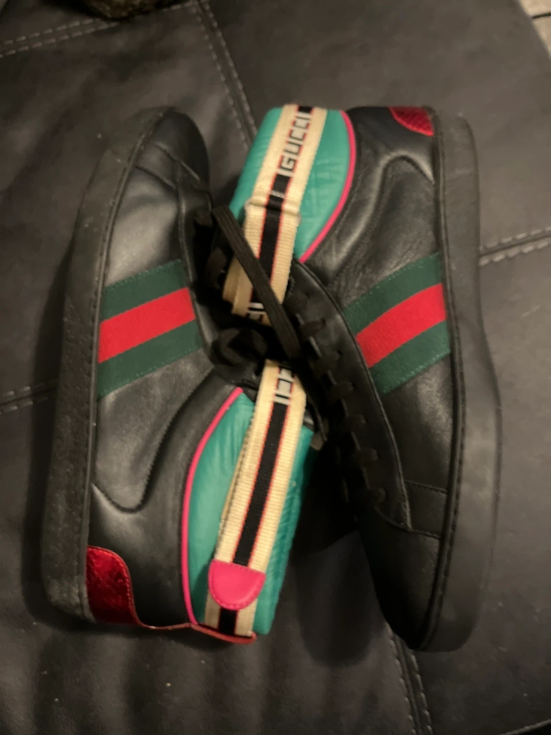 75Selling a pair of Gucci high-top sneakers in black leather. They feature the iconic Gucci stripe detail. Great for adding a touch of luxury to your everyday style! No box