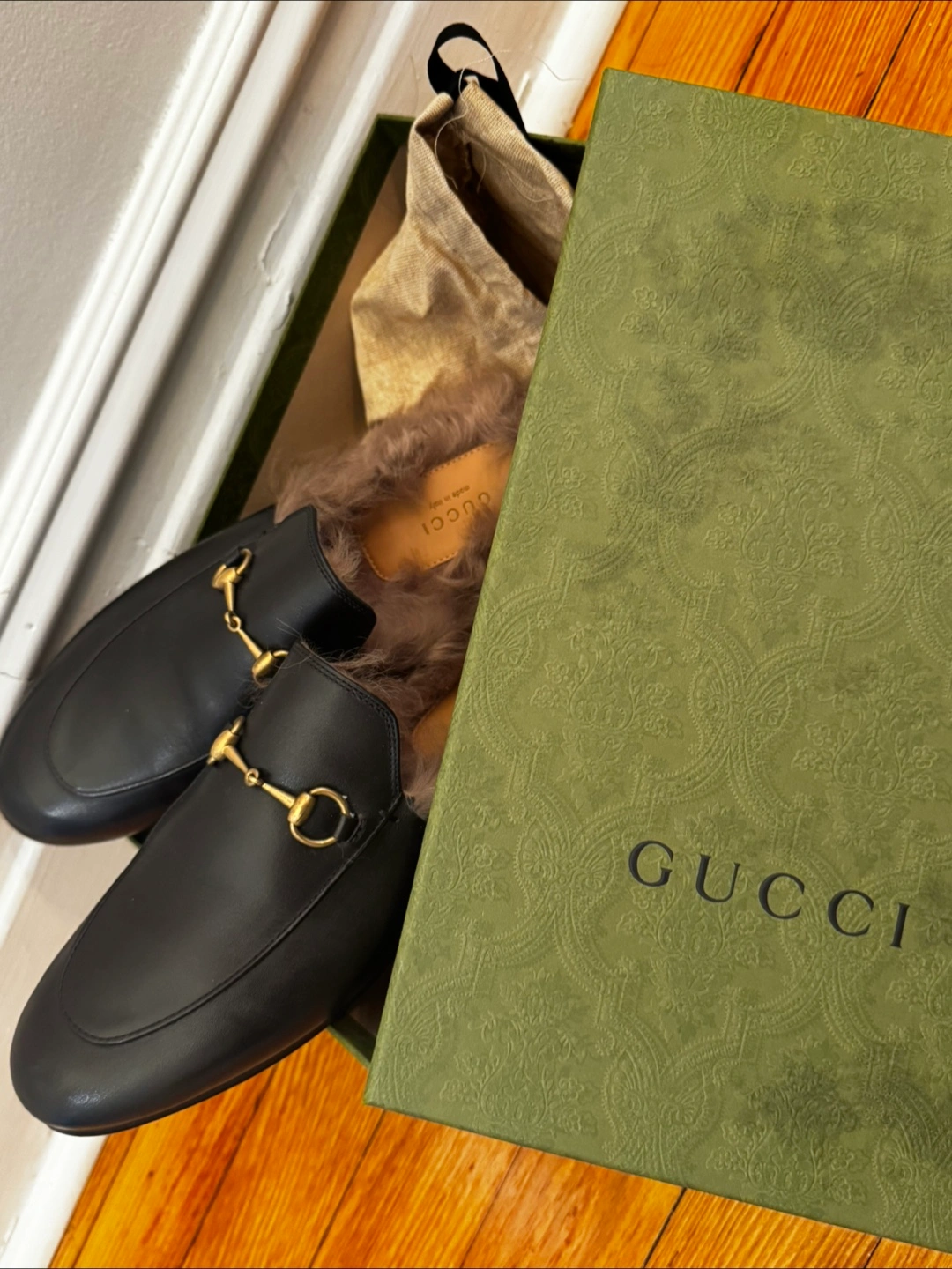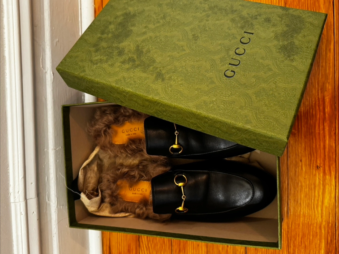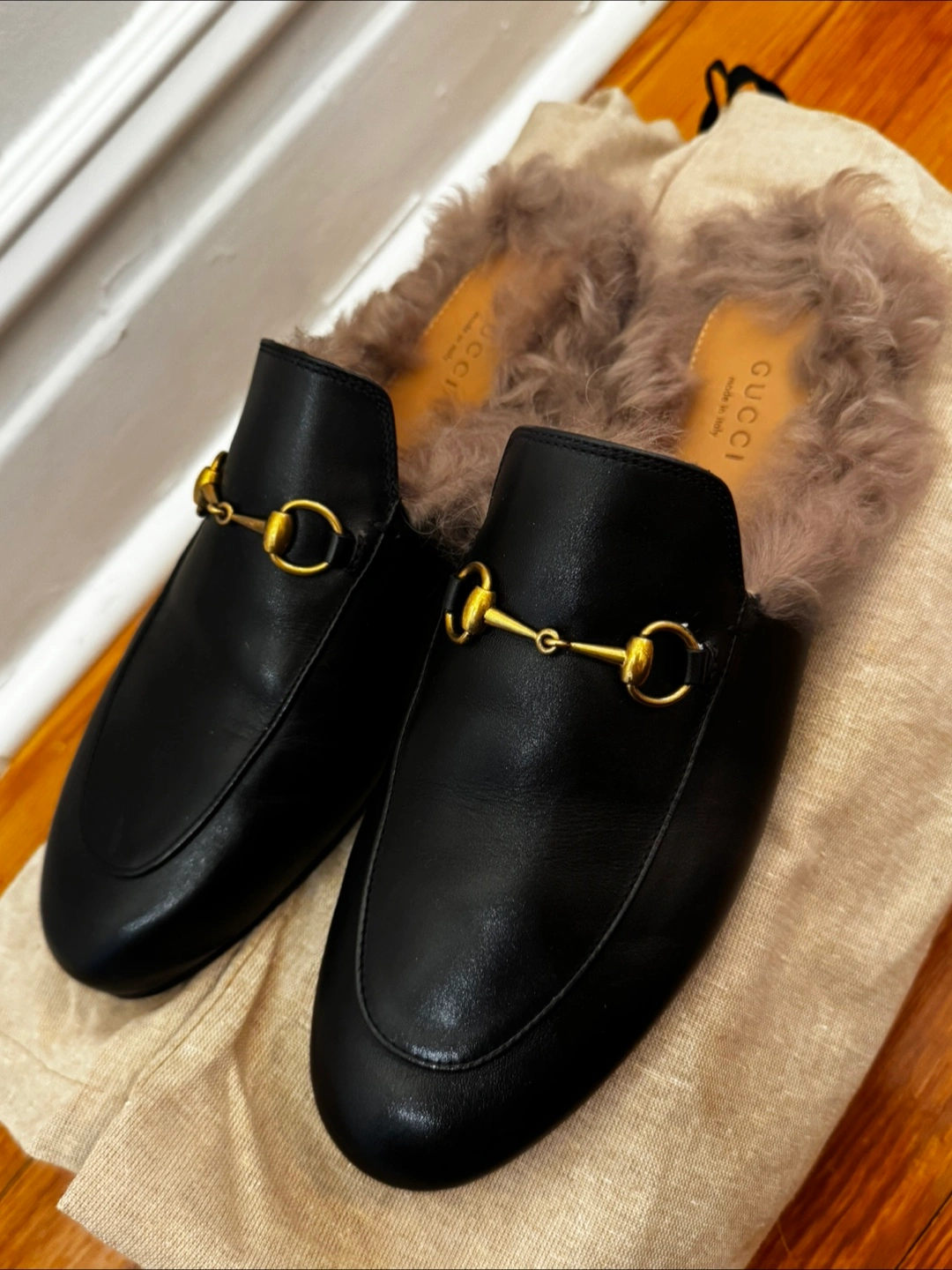 54Gucci black leather mules. Horsebit detail. Shearling lining. Comes with box and dust bag. Size 41.