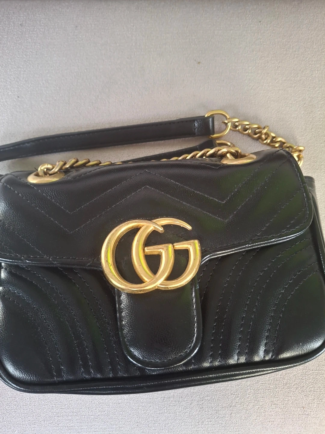 60Selling a stylish Gucci shoulder bag in black leather! It features the iconic GG logo and a chain strap. Perfect for adding a touch of luxury to any outfit