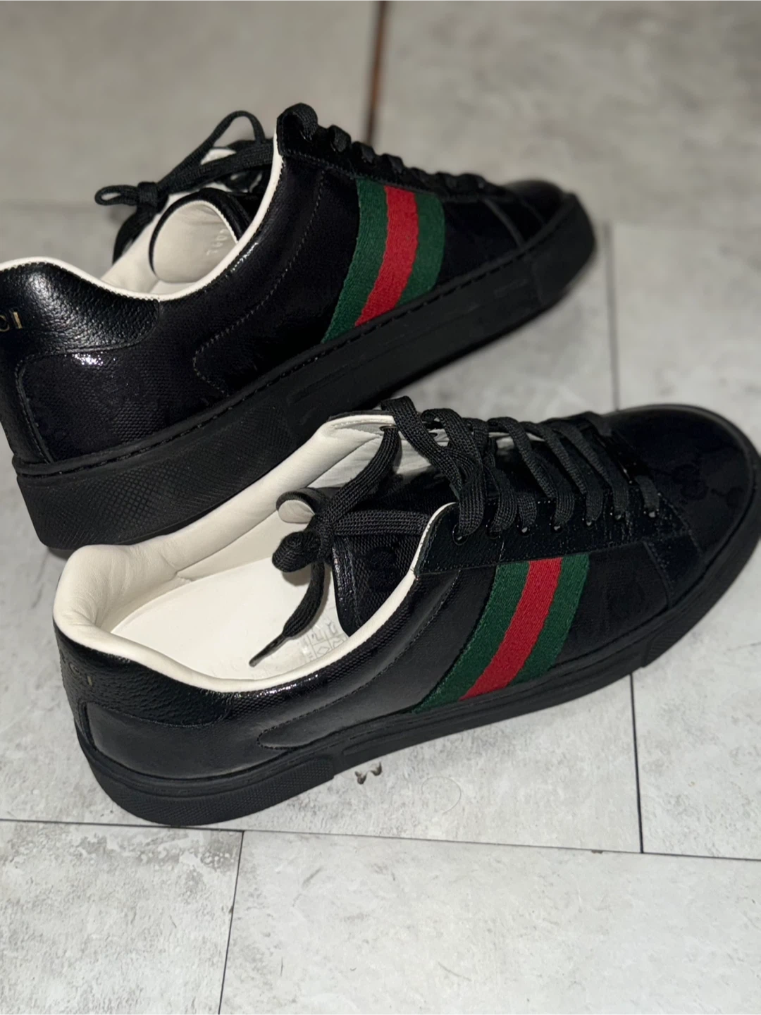 Selling a pair of stylish Gucci sneakers! They're black leather with the classic Gucci stripe. The size is 38.