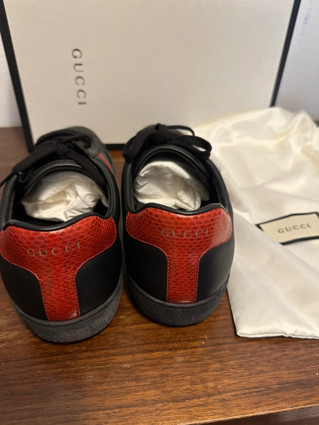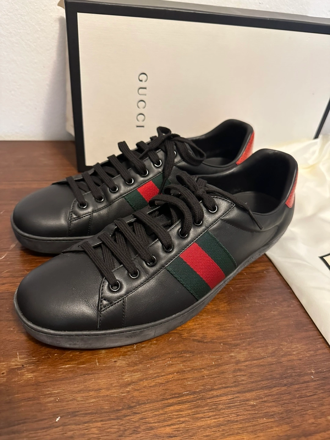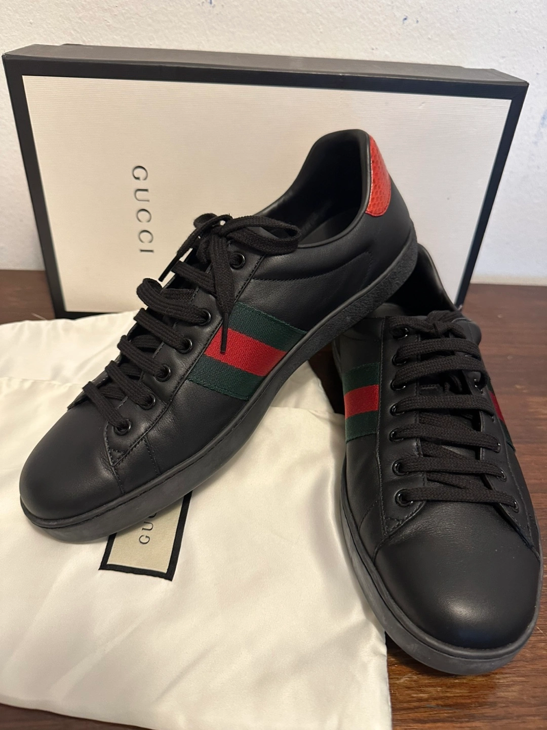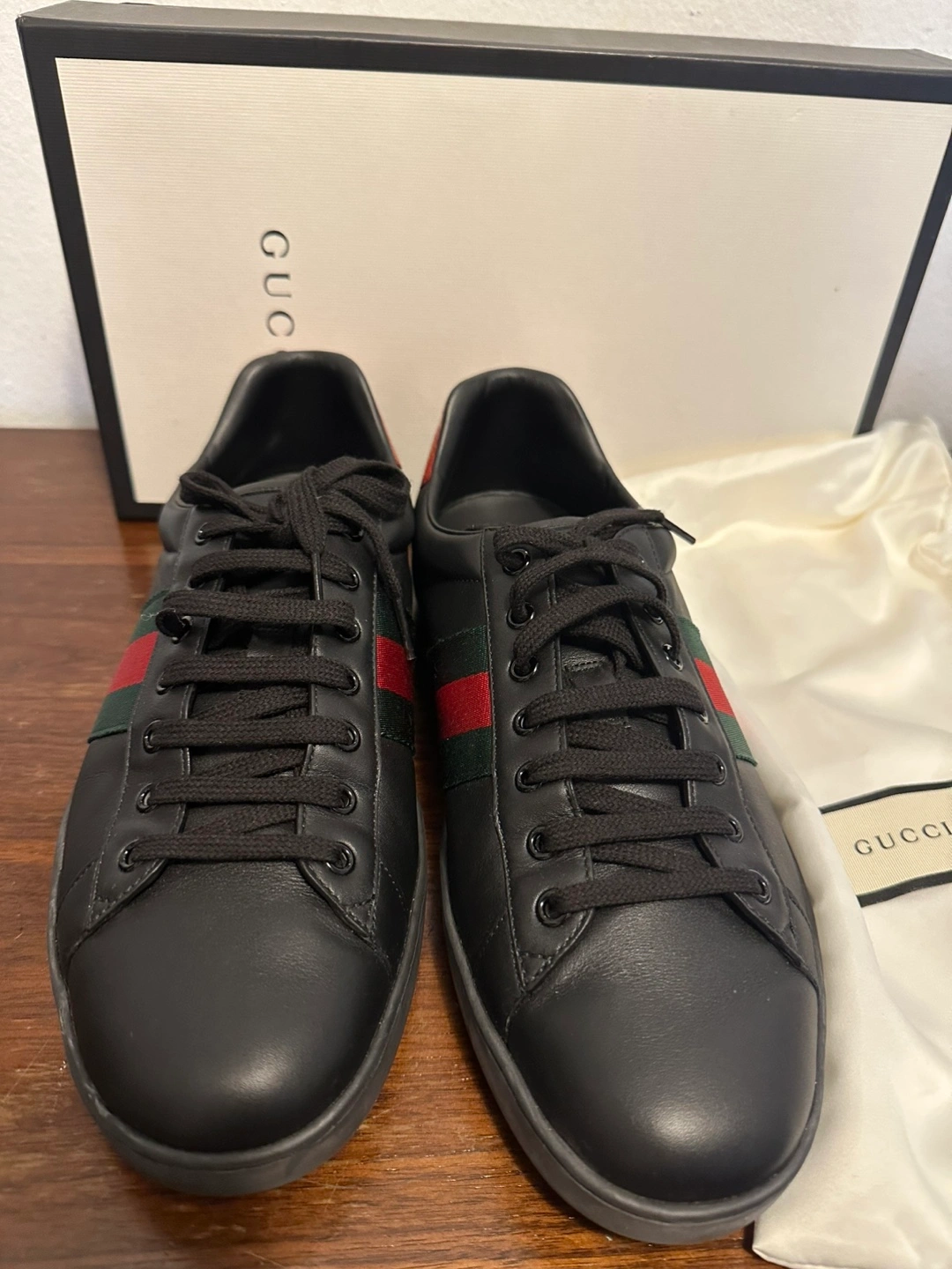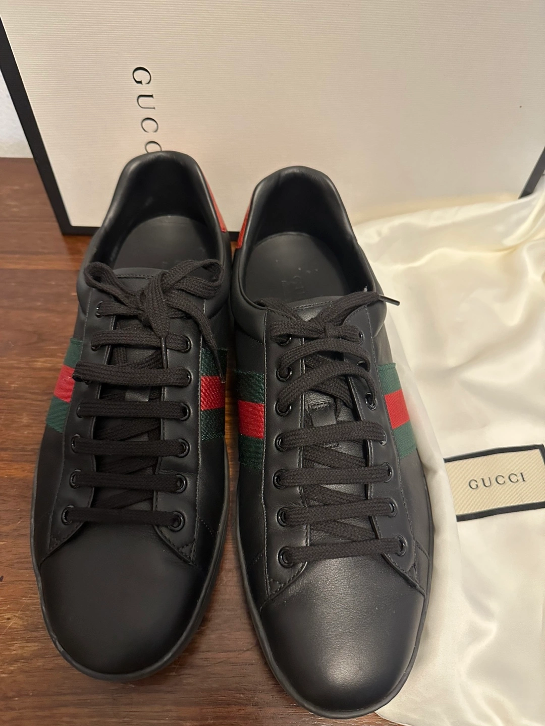 Selling a pair of Gucci black leather sneakers. These stylish sneakers feature the iconic Gucci stripe and come with the original box and dust bag. They’re in great condition and ready for a new home!